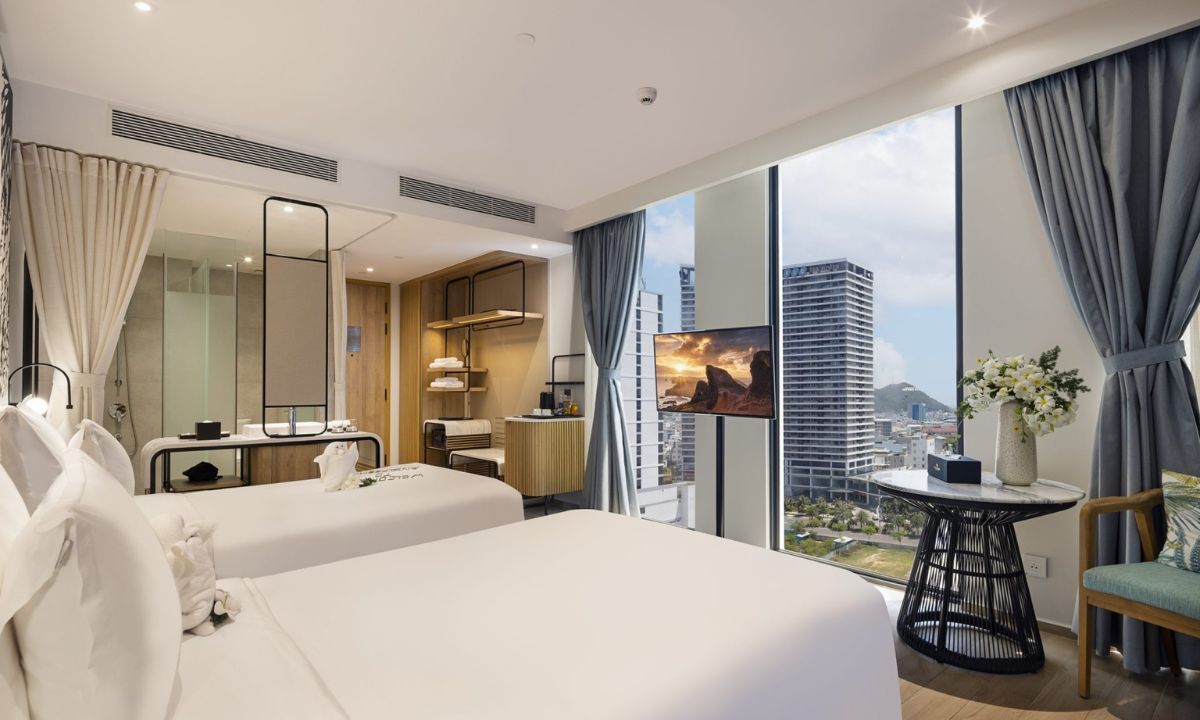 Phòng được thiết kế tinh tế với không gian ấm cúng, đảm bảo sự thoải mái tối đa cho khách. Từ đây, bạn có thể ngắm nhìn nhịp sống sôi động của thành phố Quy Nhơn.
