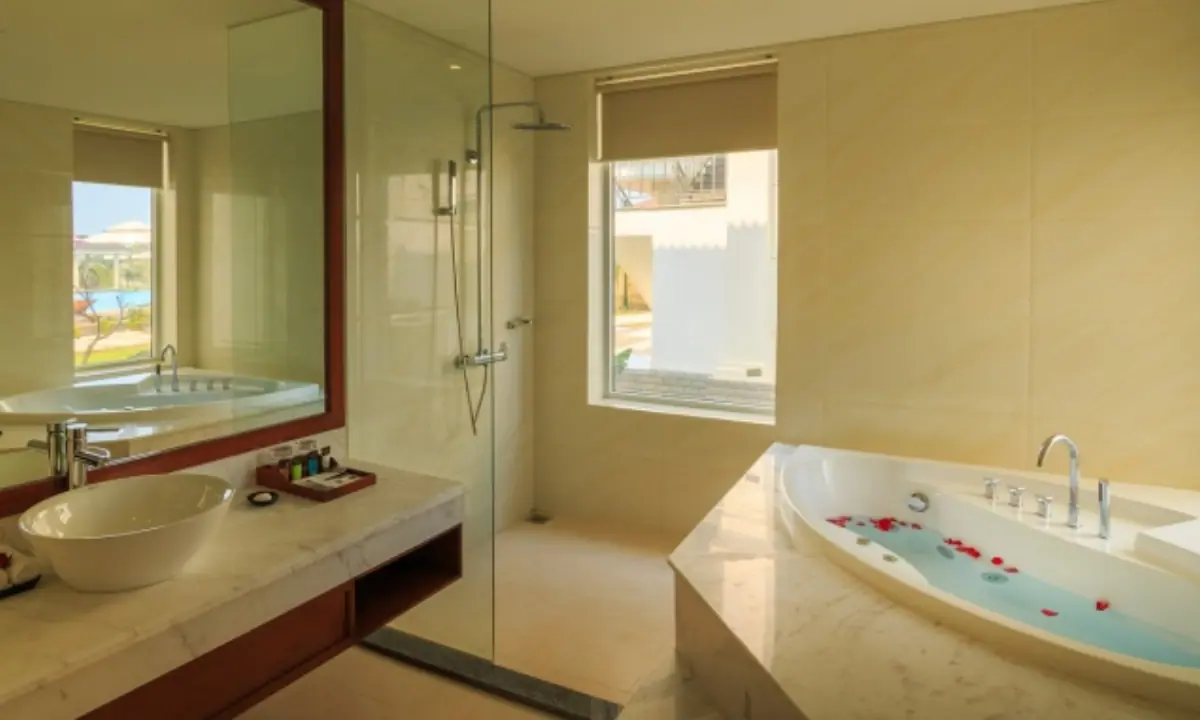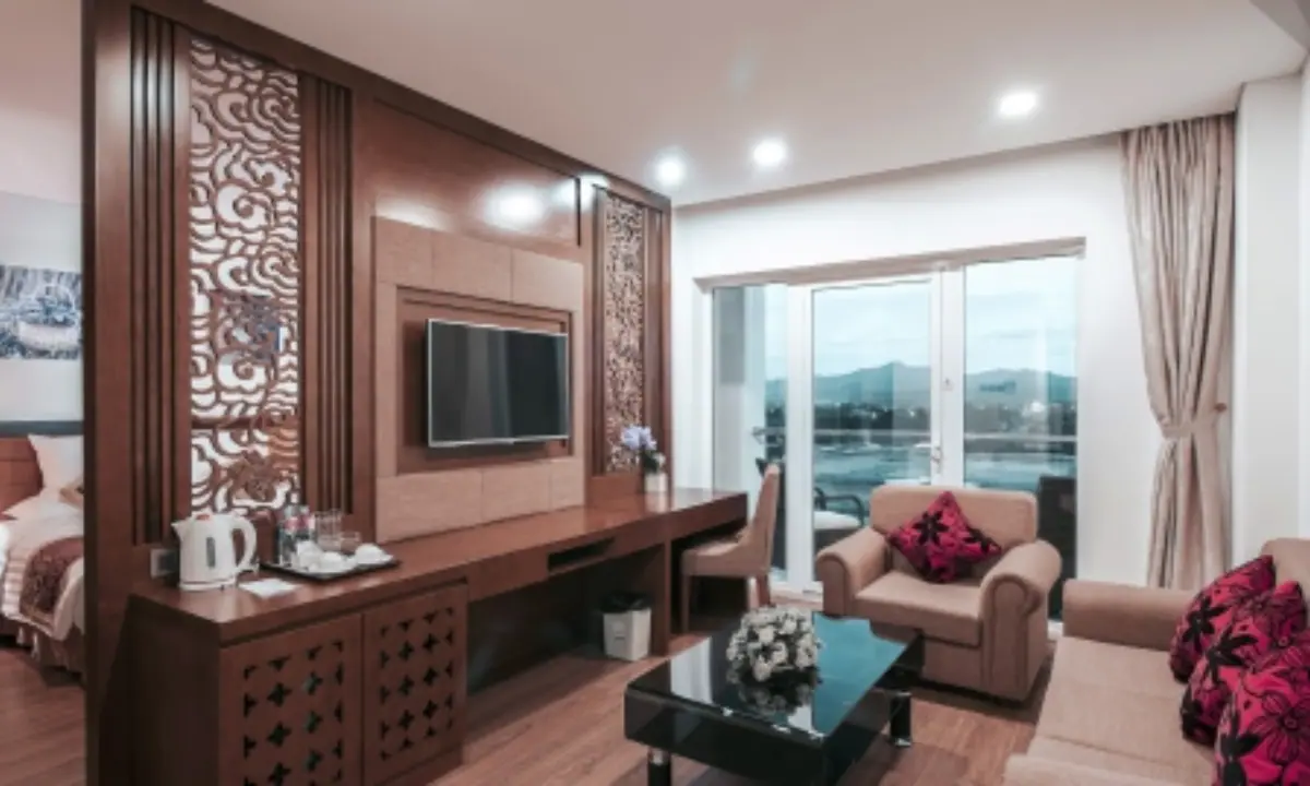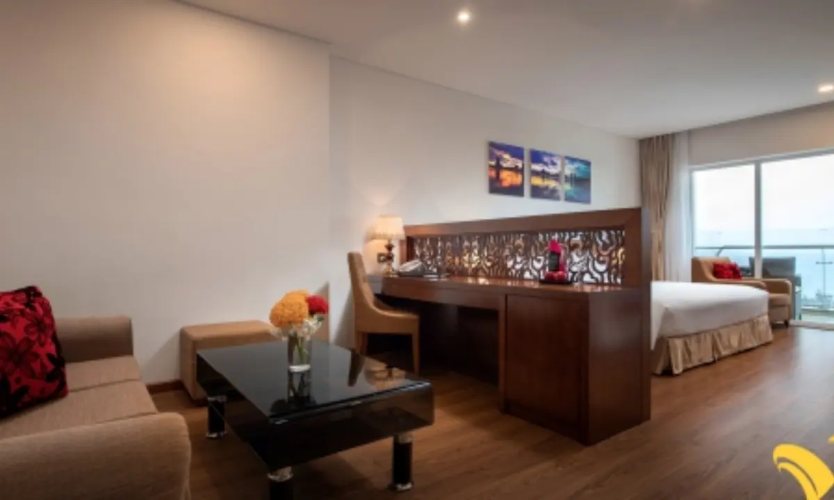 Với hạng phòng này, các bạn có thể lựa chọn phòng view biển hoặc view thành phố. Khu vực ngủ và sinh hoạt, tiếp khách được tách riêng, ngăn cách bởi tấm mành gỗ. Mỗi phòng đều có bồn sục Jacuzzi để du khách ngâm mình thả lỏng cơ thể.