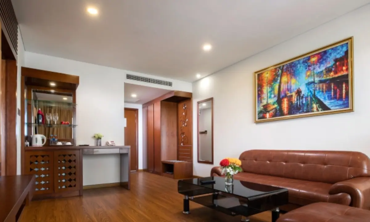 Phòng gồm 1 phòng khách và 1 phòng ngủ, có ban công thoáng và rộng nhìn về phía biển Bảo Ninh xanh thẳm và một phần hồ bơi. Trước các ban công có ghế mây, ghế sô pha êm ái để mọi người đọc sách, thưởng trà trong làn gió biển mát lạnh. Phòng sử dụng nhiều chất liệu gỗ và da tạo nên vẻ cao cấp, lịch lãm.