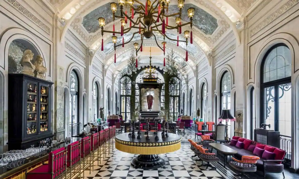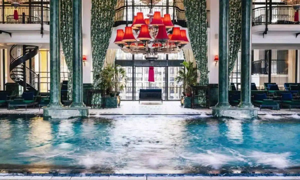 Một điểm không thể bỏ lỡ tại khách sạn là bể bơi Le Grand Bassin nằm tại tầng 7. Hồ bơi nước nóng này không chỉ là nơi để mọi người ngâm mình, mà còn là một không gian nghệ thuật với các cột đá cẩm thạch xanh ngọc lục bảo, tượng đồng và đèn chùm rực rỡ.