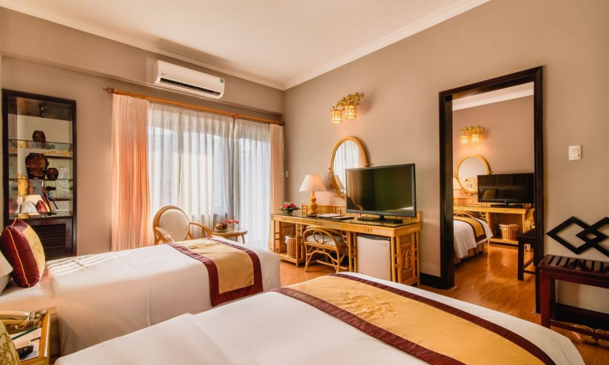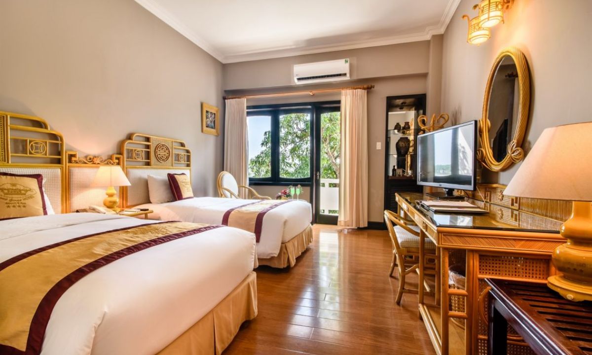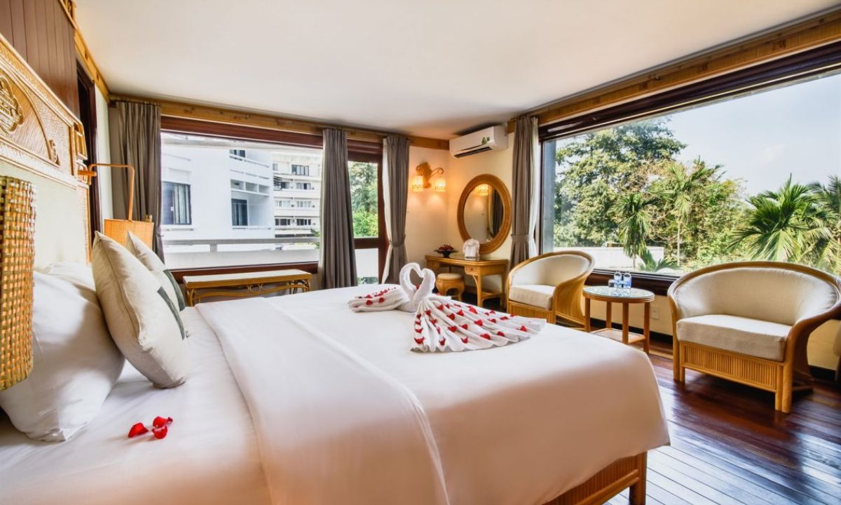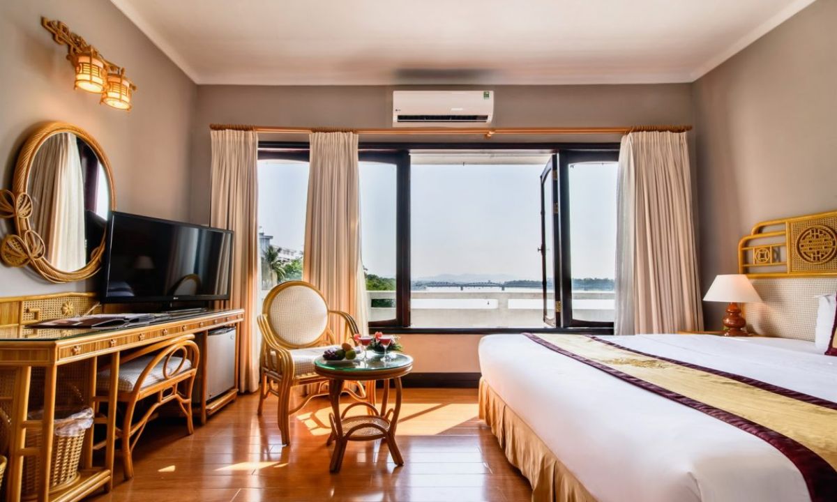 Tận hưởng vẻ đẹp quyến rũ của sông Hương từ căn phòng được bài trí xa hoa nhưng cũng dễ chịu và trang nhã. Cửa sổ lớn đón trọn ánh sáng tự nhiên, tràn đầy sức sống.