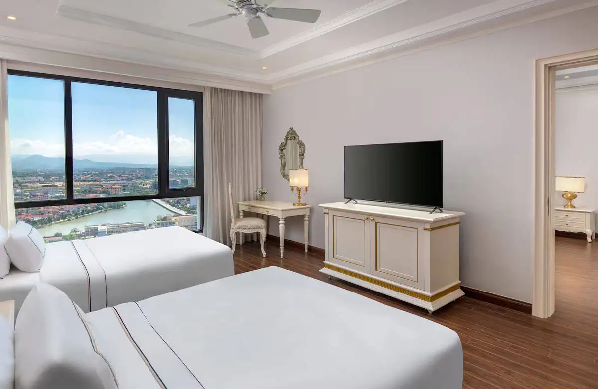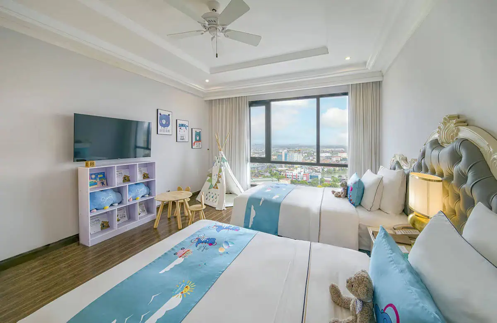 Phòng nằm trên tầng 17 của khách sạn, hướng ra thành phố mà nổi bật là chợ Đồng Hới tấp nập. Hạng phòng này gồm 2 phòng ngủ thông nhau. Trong đó, một phòng ngủ có các đồ trang trí đáng yêu phù hợp với gia đình có con nhỏ.