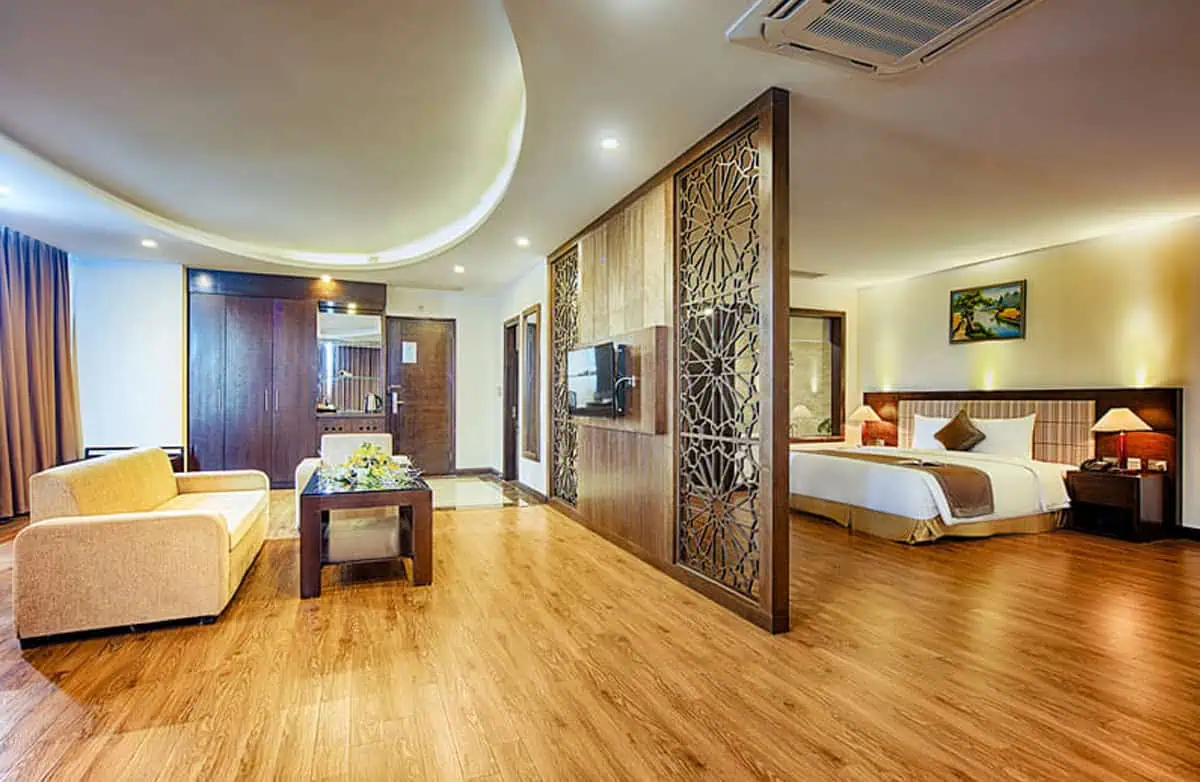 Tại phòng Grand Suite, phòng khách và phòng ngủ được tách thành 2 không gian biệt lập ngăn cách bởi bức màn gỗ chạm trổ rỗng tạo nên tính riêng tư nhưng vẫn đảm bảo sự thông thoáng cho du khách.