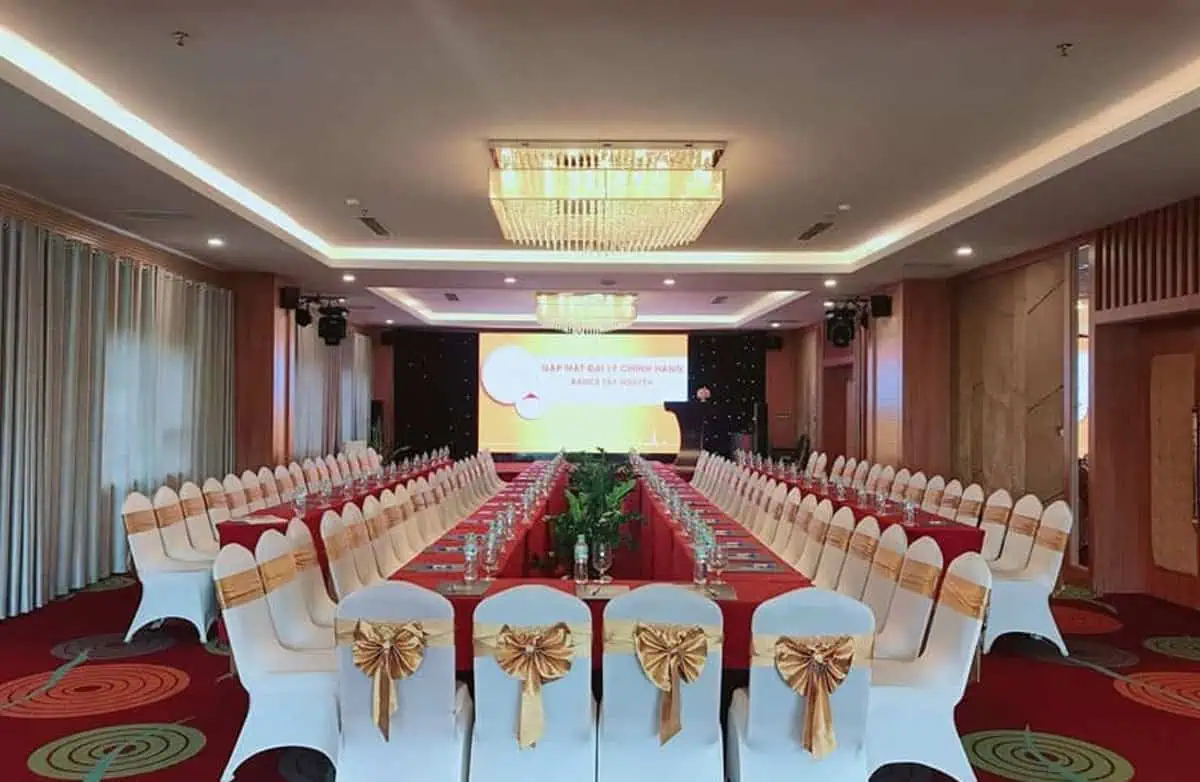 Phòng tiệc cưới và Ea Kao với quy mô lớn được lắp đặt sân khấu ấn tượng, âm thanh và hình ảnh sắc nét cùng cách trang trí nổi bật với sắc đỏ phù hợp cho những ngày trọng đại, hội họp. Phòng Ea Knin với sức chứa 120 khách sẽ thích hợp với những buổi họp hoặc tọa đàm thân mật.