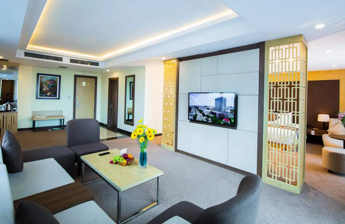 Căn phòng được trải thảm trang trọng và lịch thiệp, đầy đủ tiện nghi với trang thiết bị hiện đại từ phòng khách cho đến phòng nghỉ, phòng tắm.