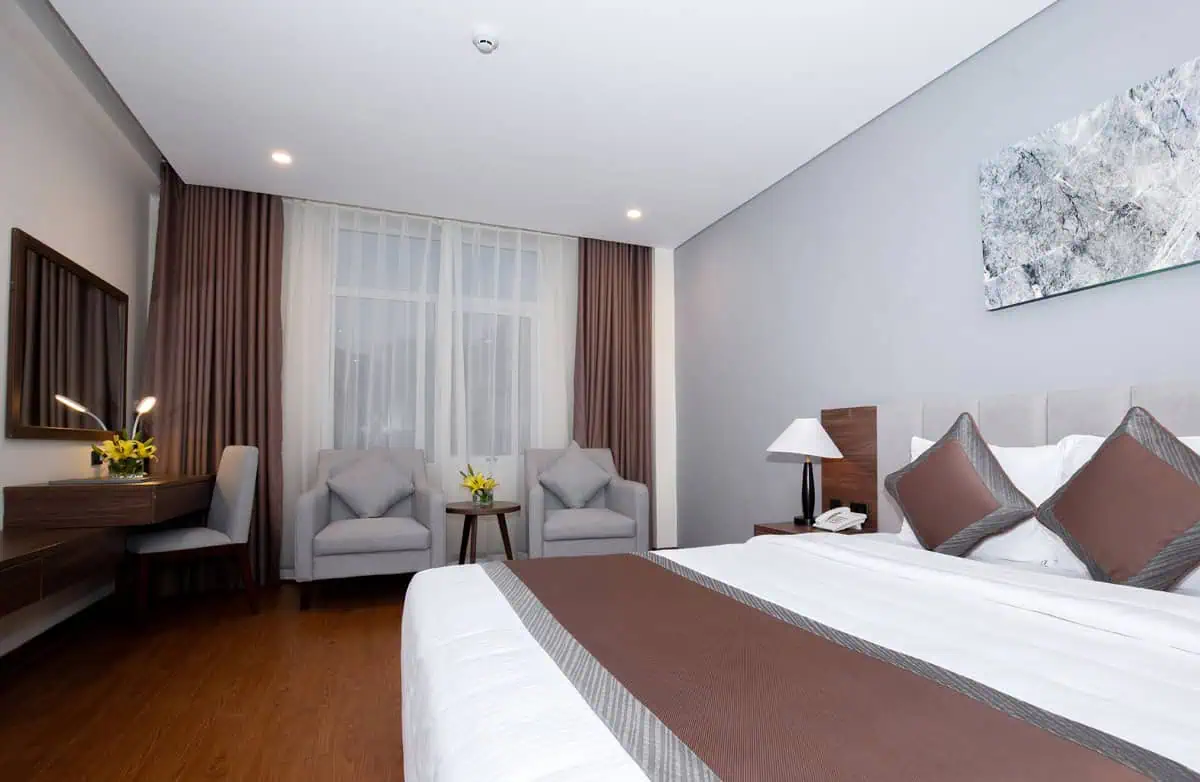 Khách sạn gồm 96 phòng được trang trí theo tone màu trung tính, nhìn đơn giản nhưng vẫn vô cùng tinh tế và đầy đủ tiện nghi. Từ ghế đến giường đều rất êm ái, phù hợp với tiết trời se lạnh của Sapa.
