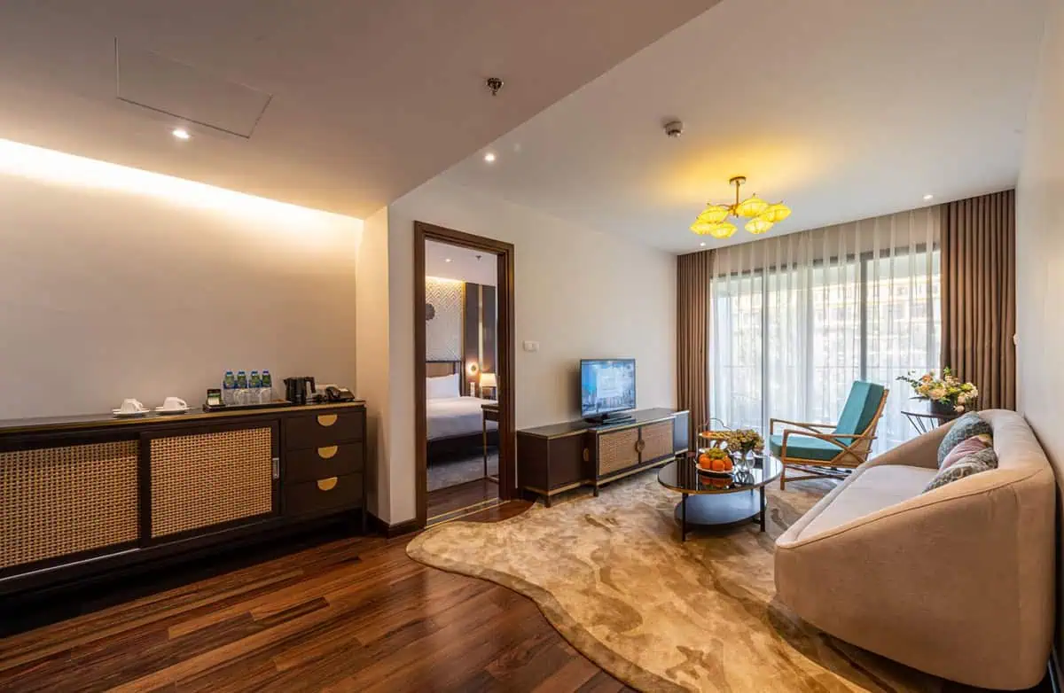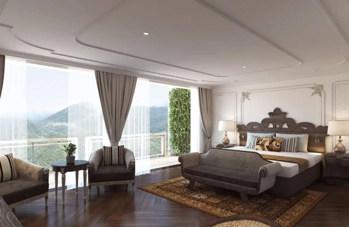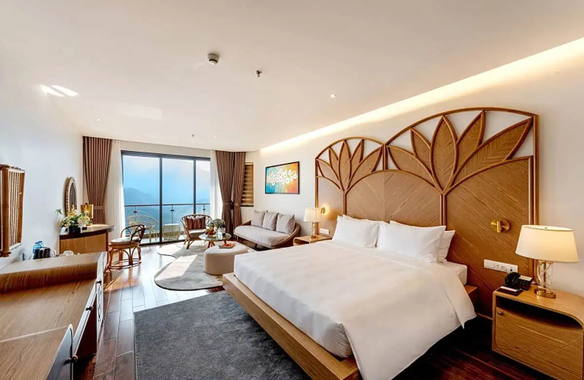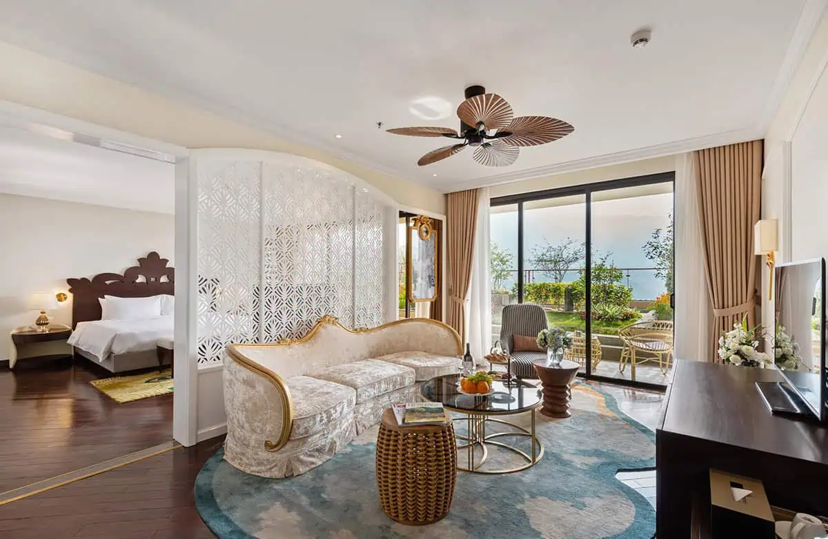 Phòng được thiết kế với phòng khách và phòng ngủ riêng biệt, nội thất cao cấp với tone màu nhã nhặn mang phong cách châu Âu đương đại. Ban công rộng trải dài qua 2 phòng nằm đối diện khu vườn xanh mát của khách sạn, đồng thời mở ra góc nhìn khoáng đạt về núi non hoang sơ.