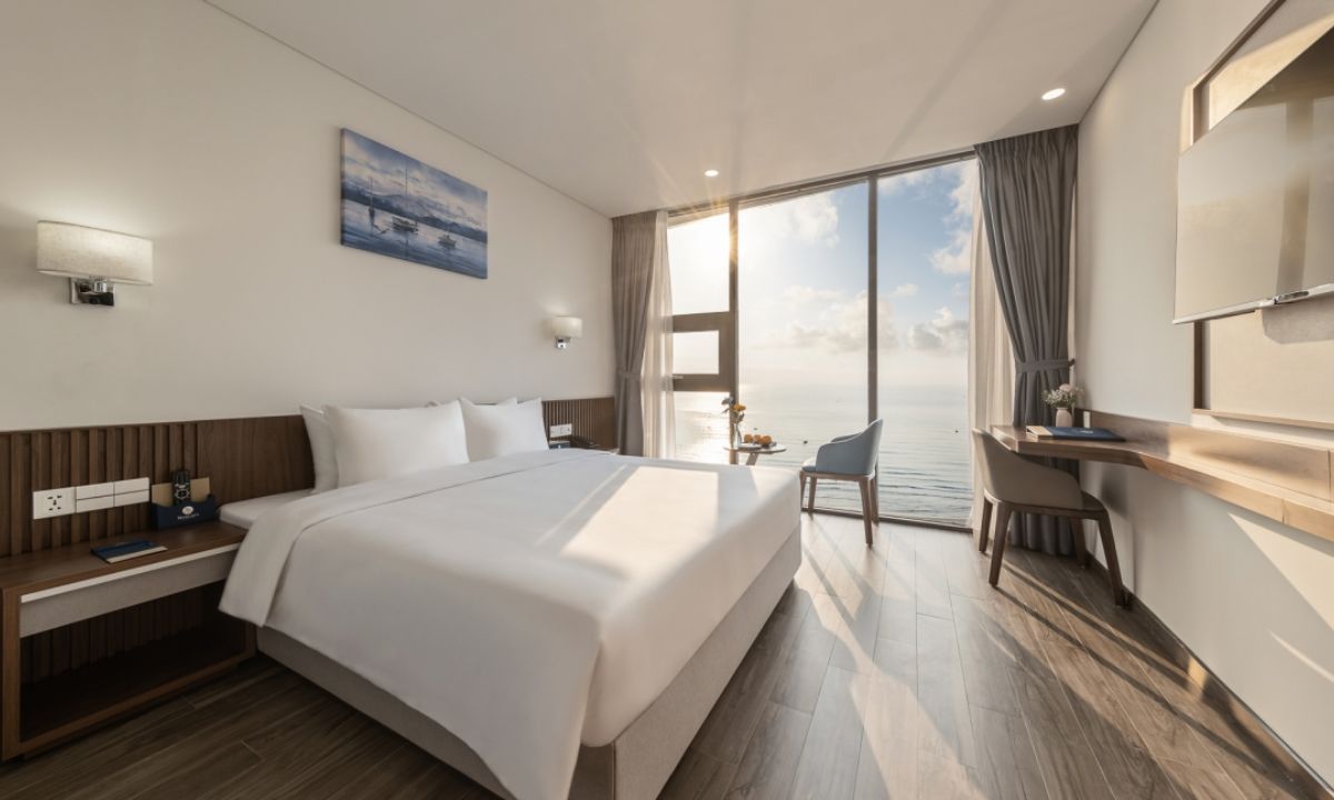 Không gian rộng rãi và tiện nghi cao cấp, phòng Premier thích hợp cho các gia đình nhỏ. Cửa sổ lớn mở ra toàn cảnh biển và thành phố, tạo cảm giác thư thái.