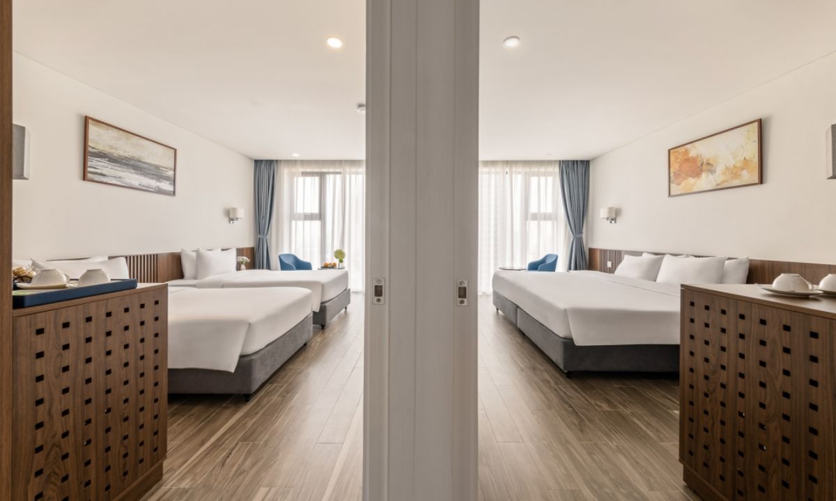 Thiết kế rộng rãi với hai phòng ngủ riêng biệt, Suite Family đáp ứng nhu cầu của gia đình đông người. Cửa sổ lớn mở ra khung cảnh biển và thành phố, mang lại không gian sum họp thoải mái.