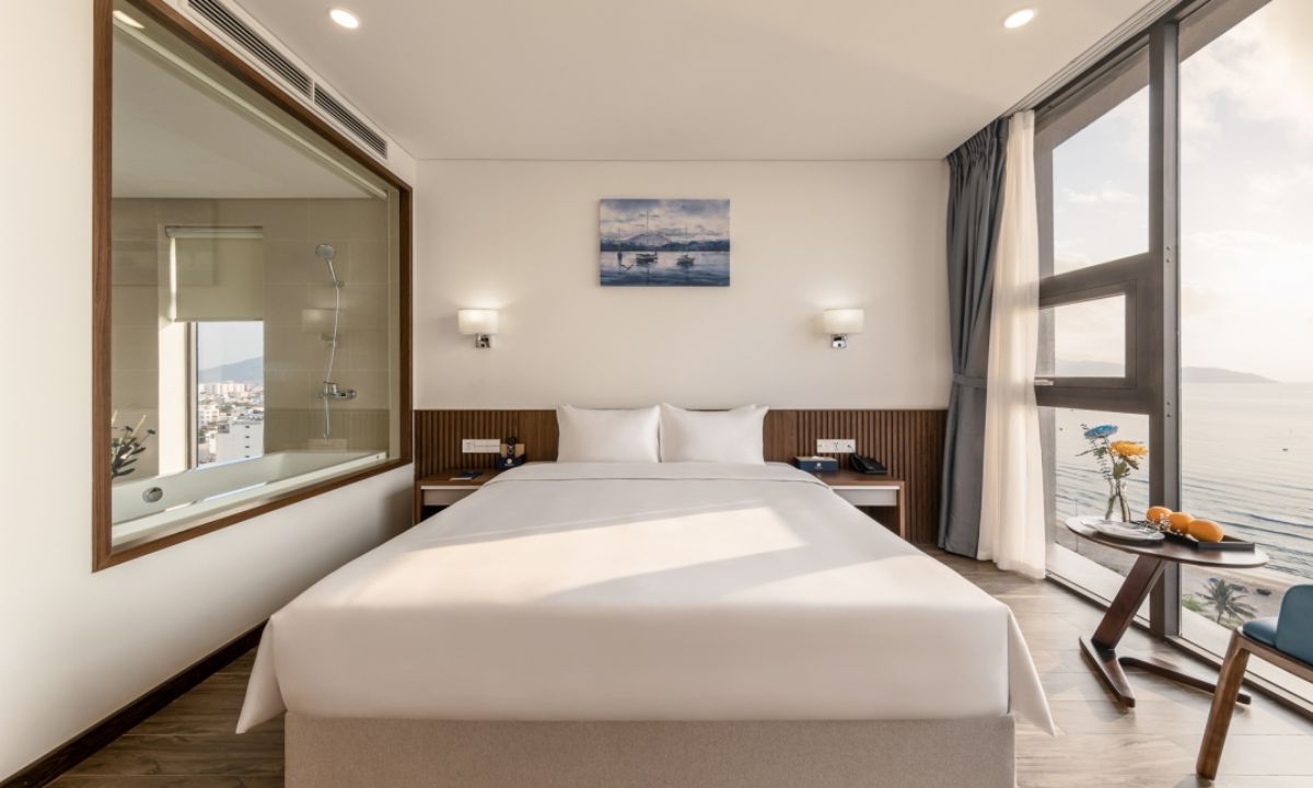 Phòng Suite mang đến không gian nghỉ dưỡng đẳng cấp với nội thất cao cấp và bồn tắm nằm thư giãn. Cửa sổ lớn giúp du khách thưởng ngoạn vẻ đẹp biển và bán đảo Sơn Trà ngay từ phòng.