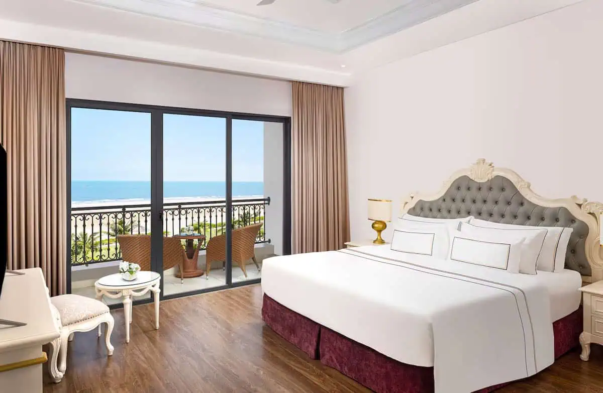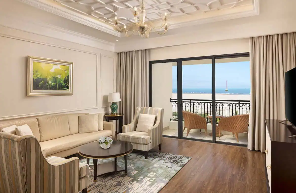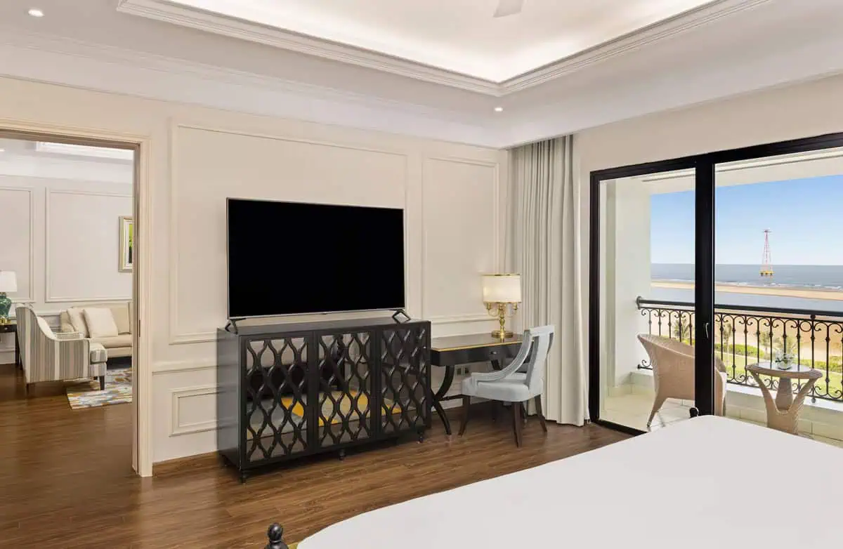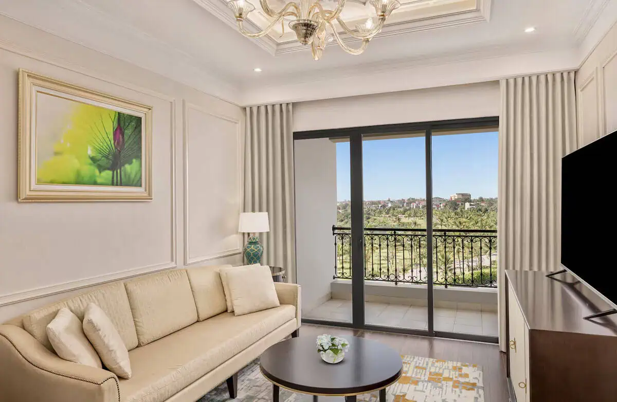 Phòng Suite gồm 01 phòng khách và 01 phòng ngủ có ban công hướng ra biển Cửa Hội cho du khách đón những làn gió biển mát lành ngay trên giường ngủ.