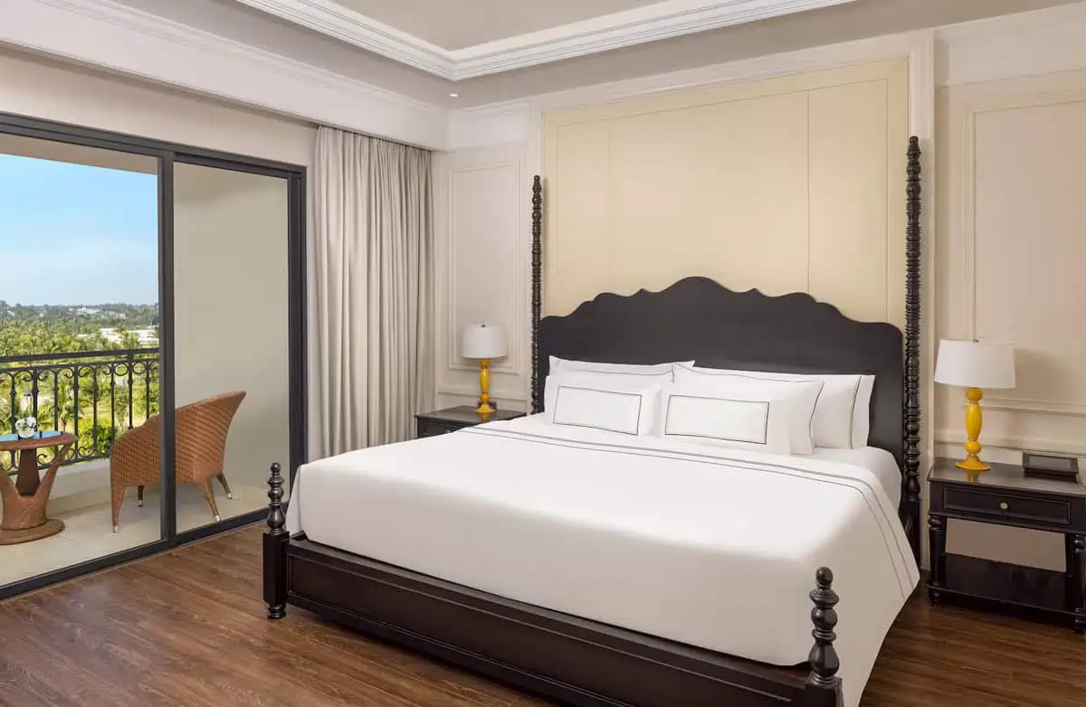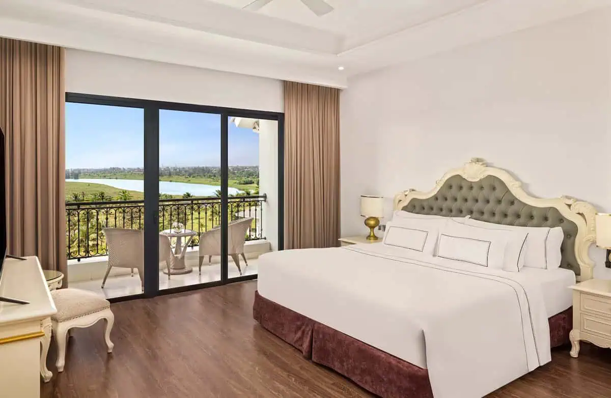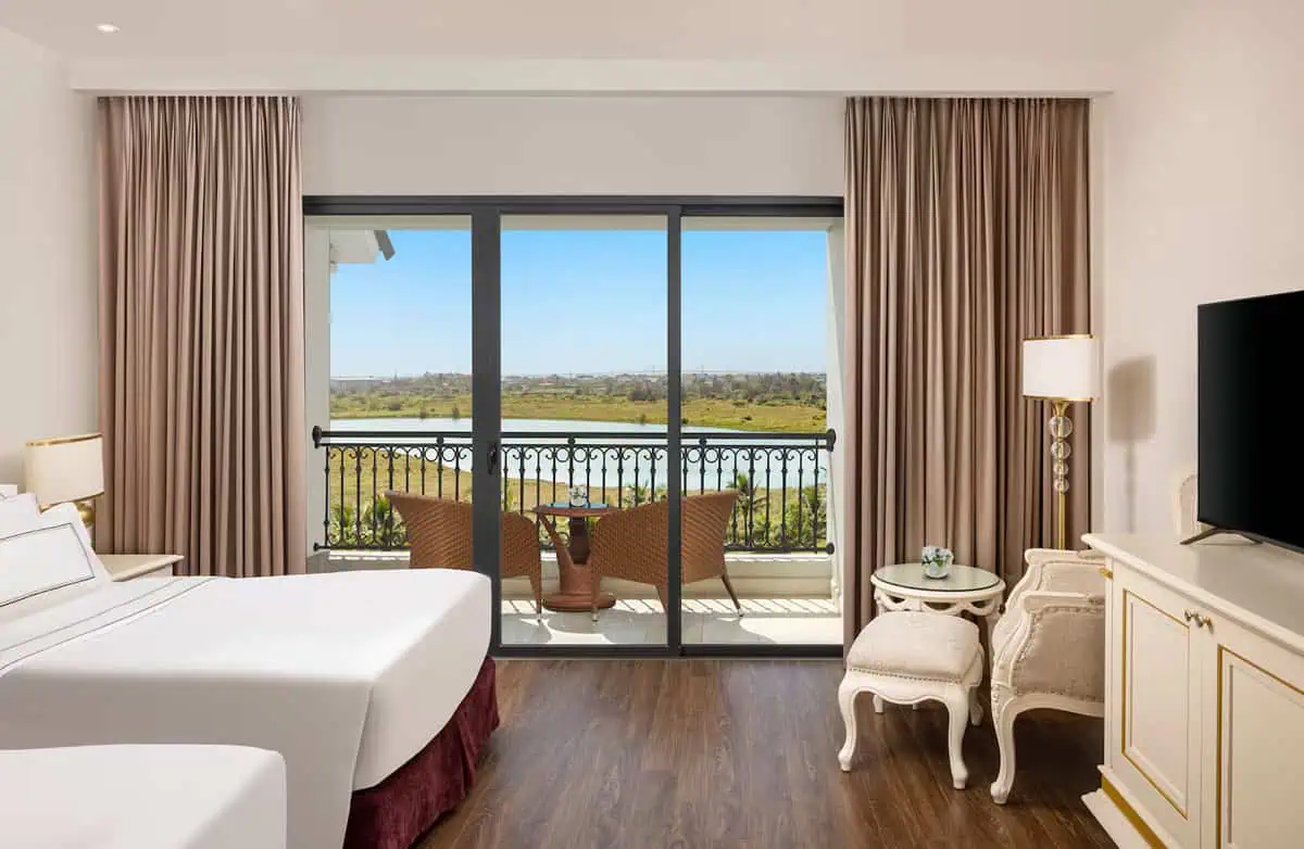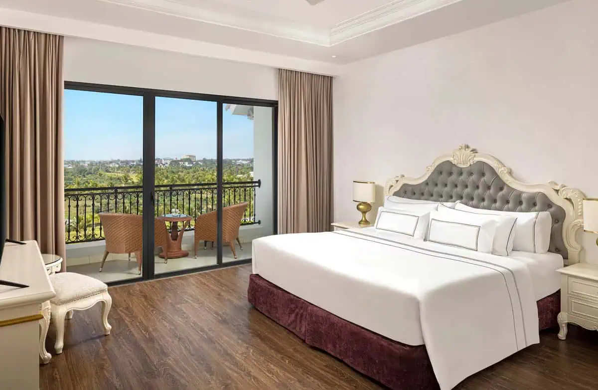 Phòng Suite gồm 01 phòng khách và 01 phòng ngủ có ban công hướng ra biển Cửa Hội cho du khách đón những làn gió biển mát lành ngay trên giường ngủ.