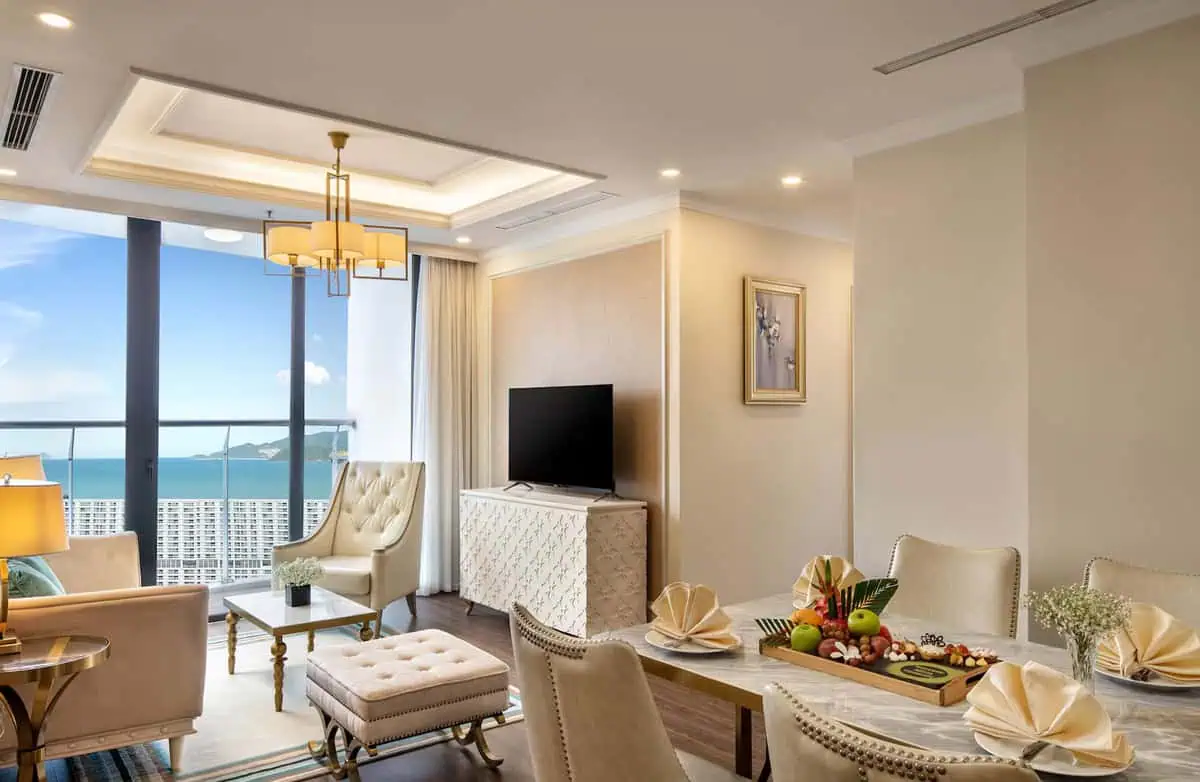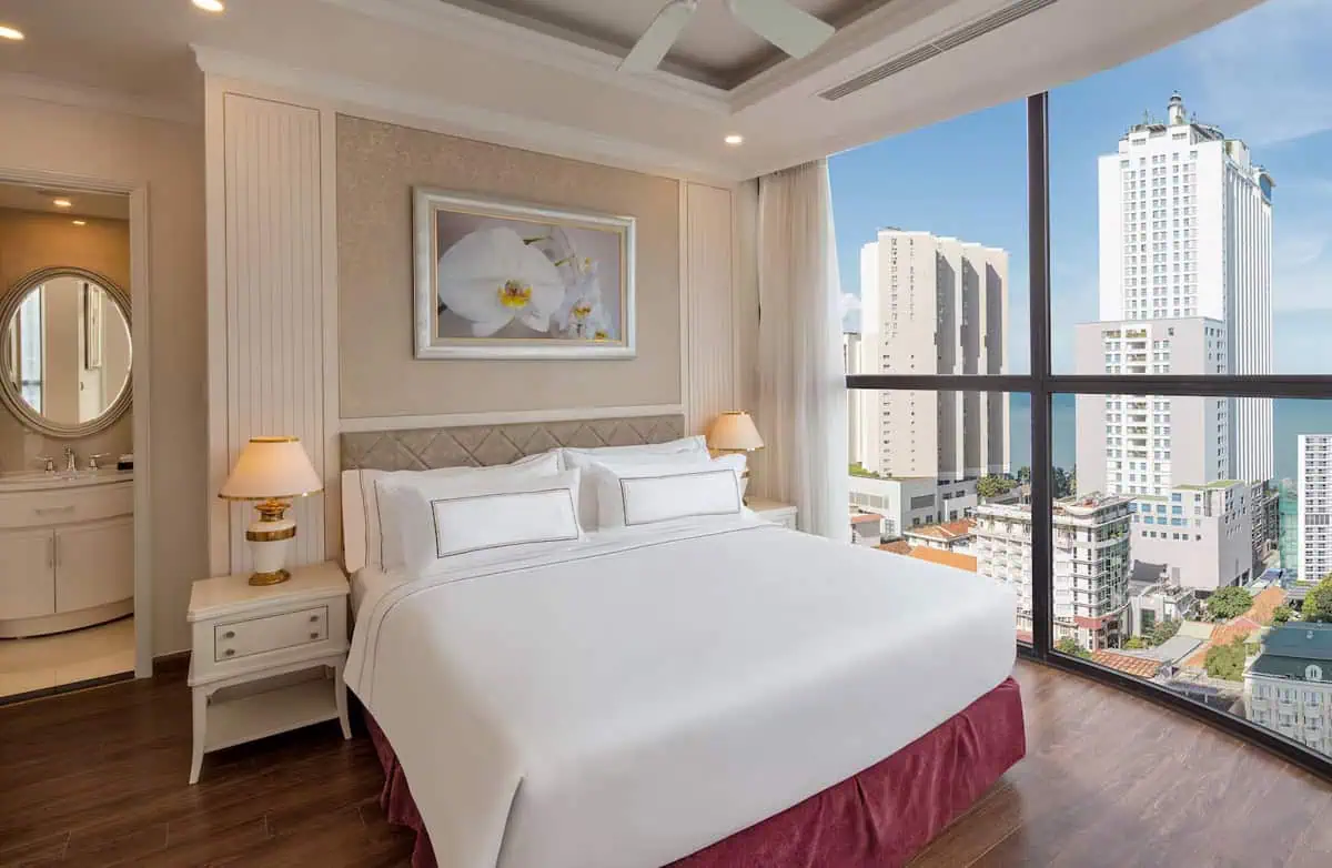 Khách sạn có nhiều hạng phòng khác nhau từ Studio đến Suite. Mỗi phòng đều được lắp đặt đầy đủ tiện nghi, có khu vực sinh hoạt và ăn uống riêng biệt, cửa kính không khung giúp mở rộng thêm không gian và ban công rộng rãi có tầm nhìn thoáng đãng phóng ra Vịnh Nha Trang. Dù là bất kỳ buổi nào trong ngày, du khách cũng có thể đắm mình vào không gian tuyệt diệu của thiên nhiên, của những buổi sớm mai mặt trời lấp ló sau rặng núi hay những chiều chạng vạng tối bên tiếng sóng vỗ bờ nhè nhẹ.