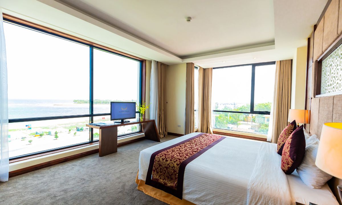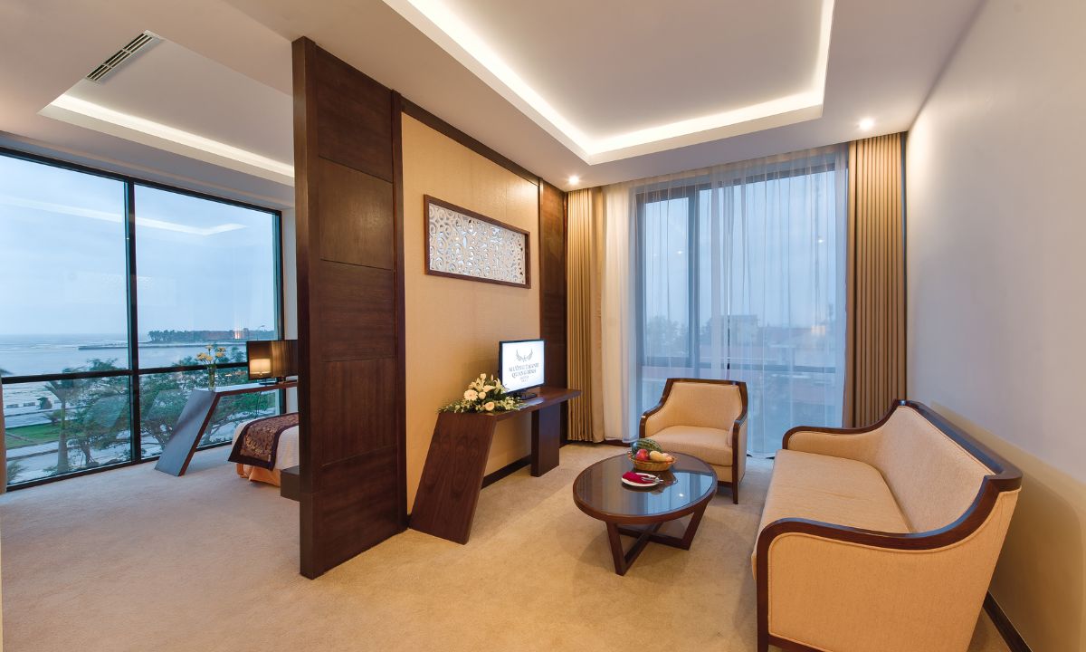 Phòng hướng trực tiếp ra biển Nhật Lệ rộng lớn. Ở hạng phòng này, khu vực nghỉ ngơi và làm việc, tiếp khách được tách riêng giúp tối ưu không gian sống.
