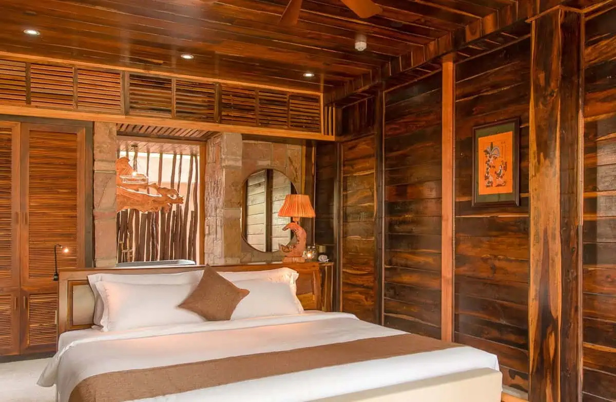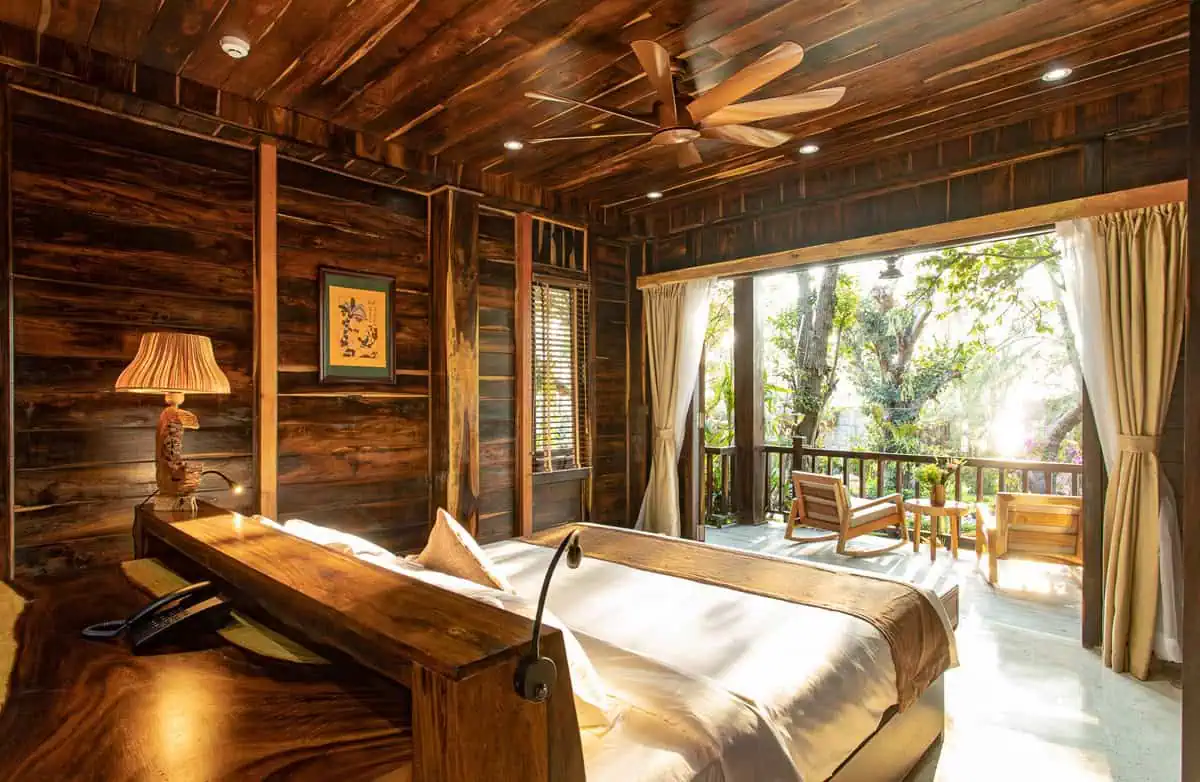 Căn phòng ẩn mình giữa những hơi thở của khu rừng nhiệt đới, ưu tiên sử dụng chất liệu gỗ vừa thân thiện vừa tạo nên cảm giác gần gũi, thoải mái.