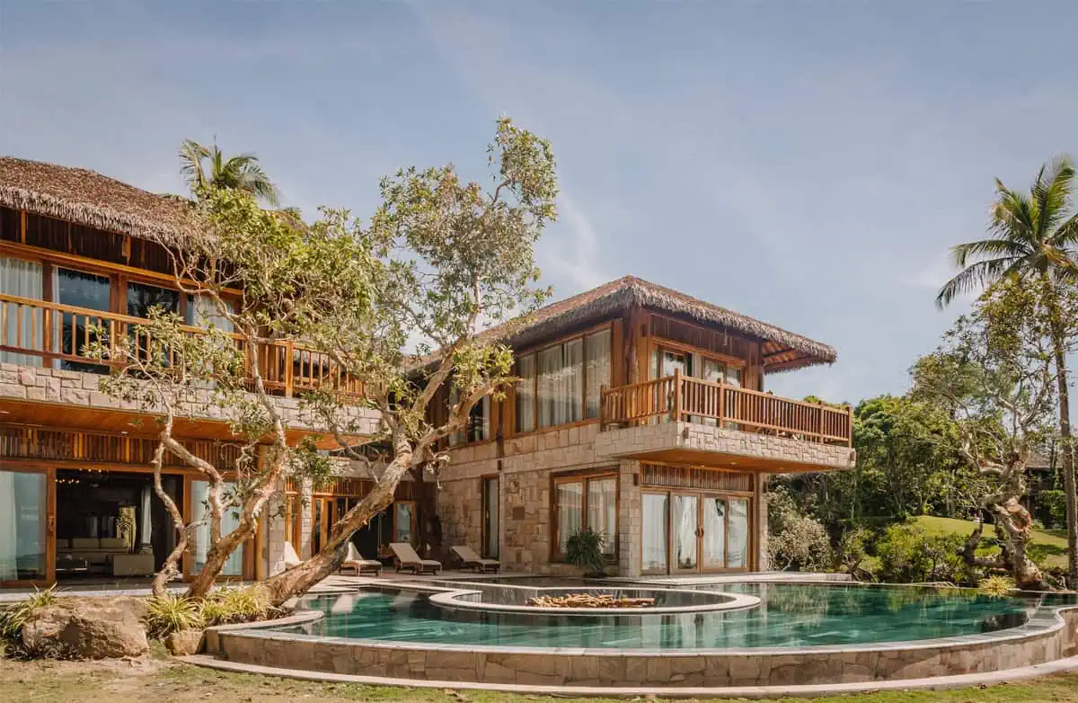 Căn biệt thự 2 tầng nằm bên bờ biển lộng gió, có các khu vực nghỉ ngơi, làm việc, vui chơi, ăn uống được tách riêng rất riêng tư. Hồ bơi riêng uốn lượn là nơi để mọi người ngâm mình thư giãn sau một ngày dài.