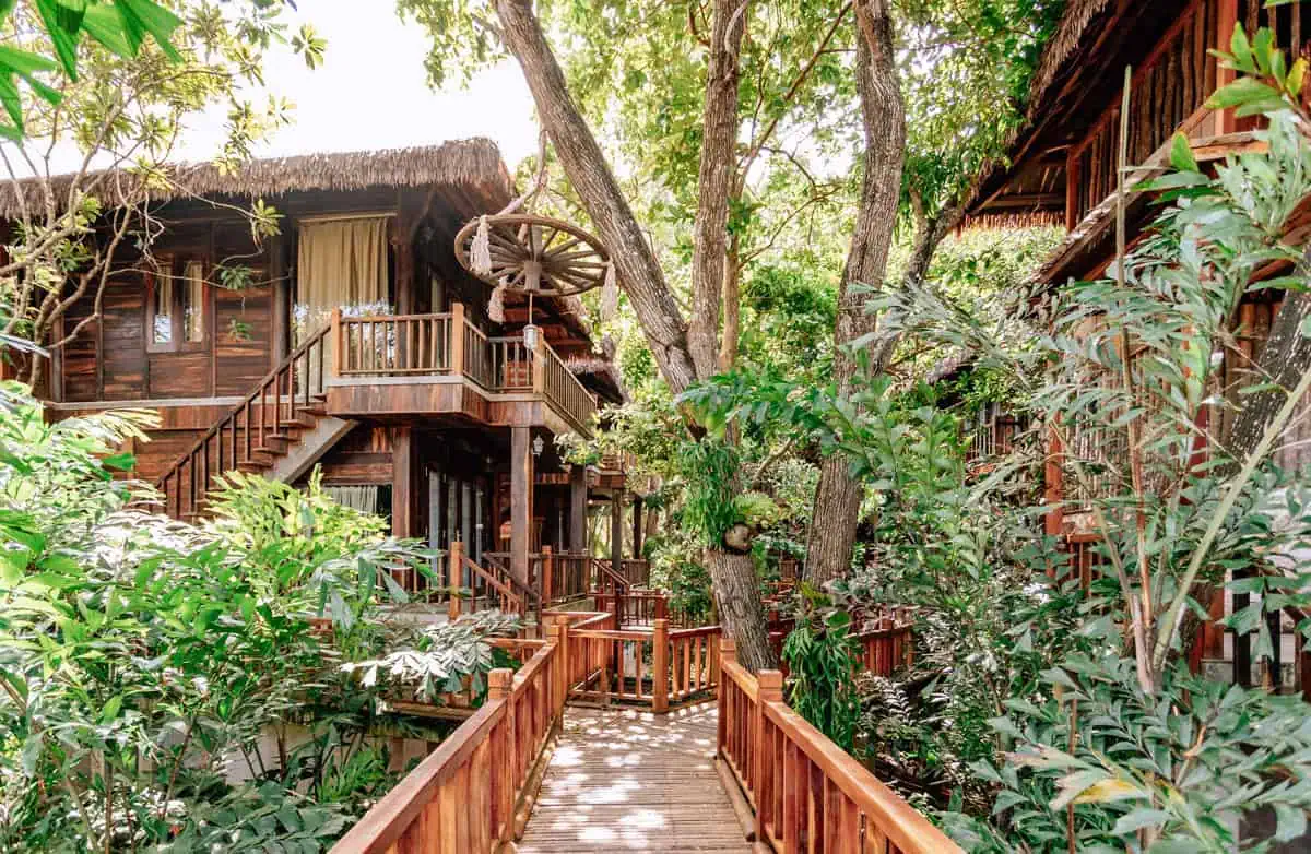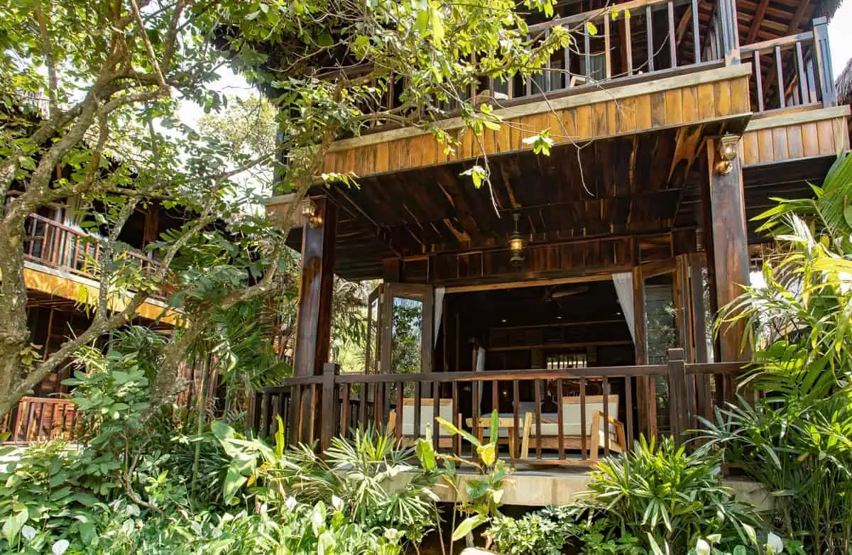 Premium jungle bungalow ở tầng trên của dãy nhà gỗ, có tầm nhìn ra khu rừng riêng tư xanh mát thông qua ban công rộng mở.