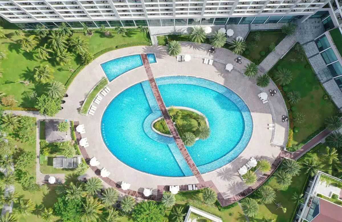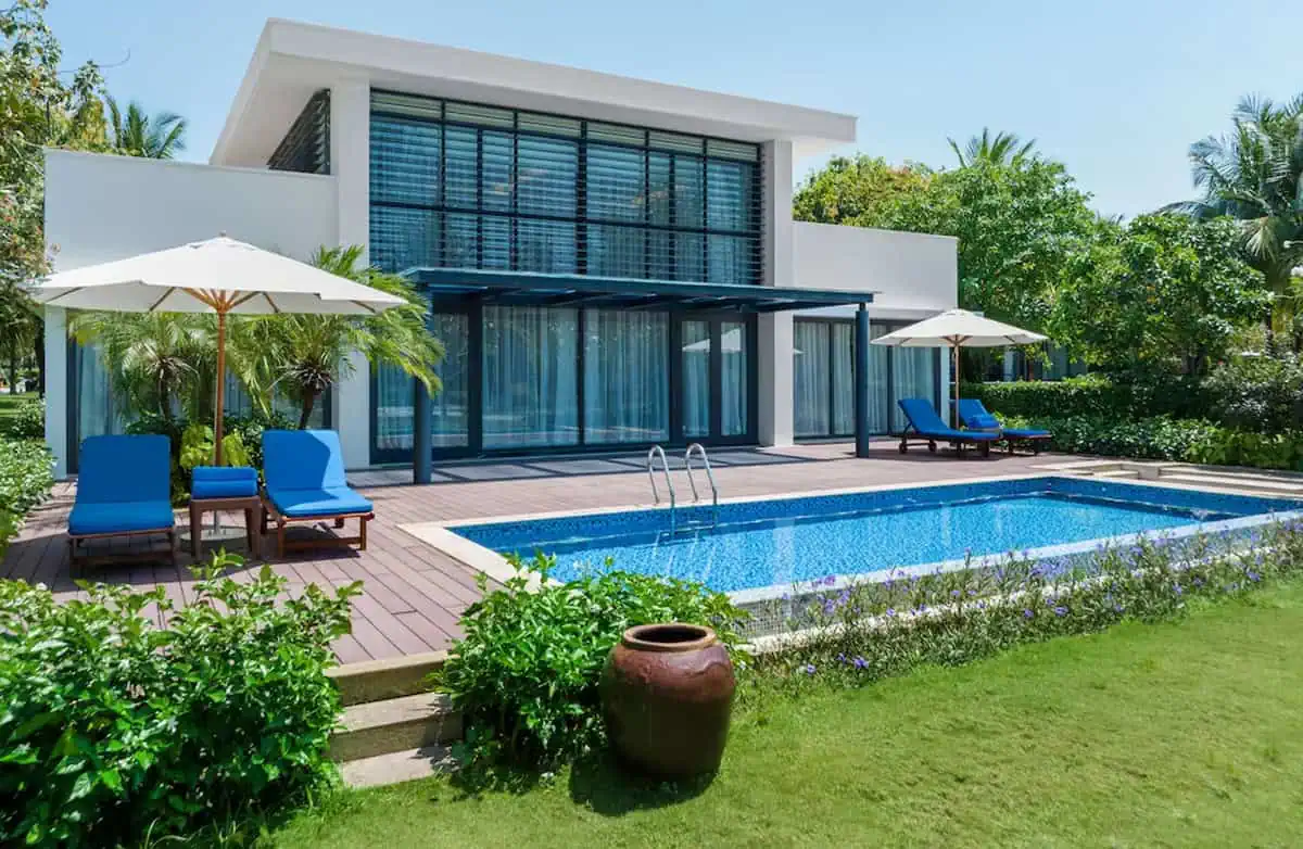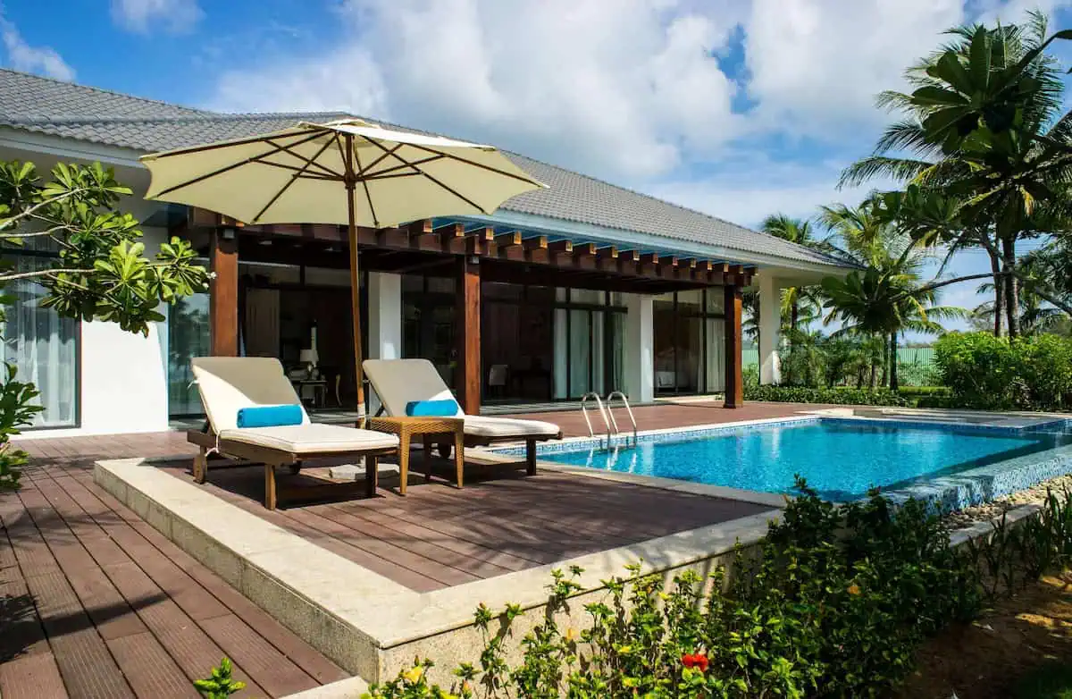 Bên cạnh các tiện ích như biệt thự 02 phòng ngủ, hạng biệt thự này còn có bể bơi riêng cho trẻ em. Nằm nép mình bên hàng dừa xanh mát, hồ bơi trong vắt cùng hiên nhà rộng rãi, căn biệt thự đẹp như một bức tranh trong chuyện cổ tích.