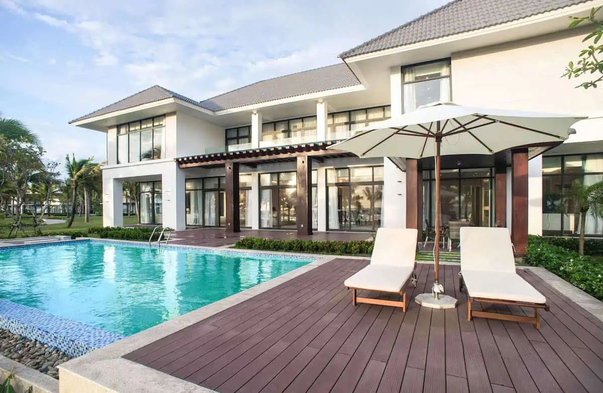 Căn biệt thự gồm 2 tầng, có 06 phòng ngủ, hồ bơi riêng và bàn ăn cho 10 người. Tầng trên có ban công, tầng dưới có lối dẫn ra hồ bơi.