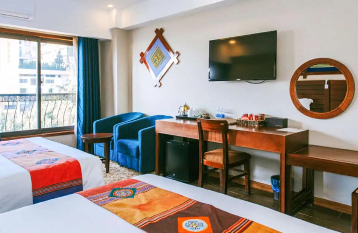 Phòng có ban công riêng, rộng rãi nhìn ra dãy núi cao nhấp nhô trong biển sương và một phần thành phố náo nhiệt. Nội thất trong phòng được làm từ chất liệu gỗ thân thiện kết hợp với thảm tạo nên sự ấm áp thích hợp cho thời tiết khắc nghiệt ở vùng núi.