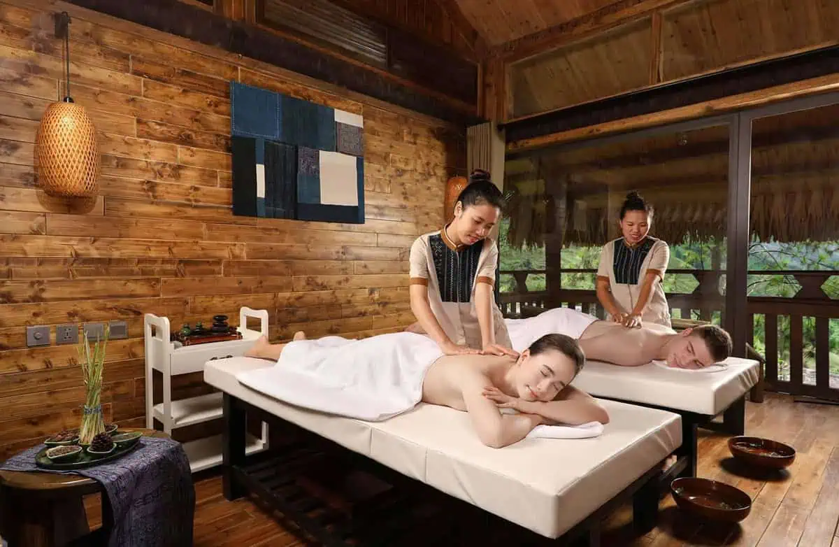 Ngay cả khu vực spa cũng sở hữu tầm nhìn sang xịn mịn là thung lũng Mường Hoa. Tại đây, các bạn sẽ được massage thư giãn bởi các trị liệu địa phương như đá nóng, tắm lá thuốc cổ truyền người Dao đỏ, massage bấm huyệt, thải độc.