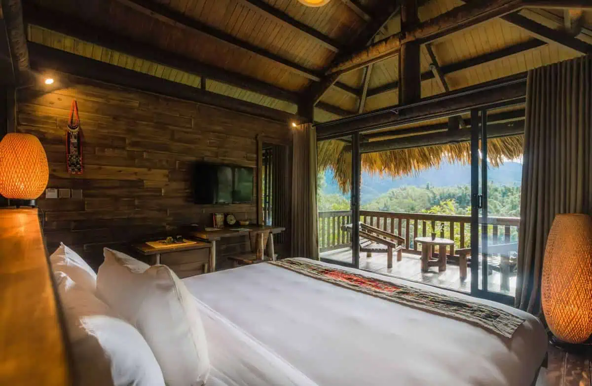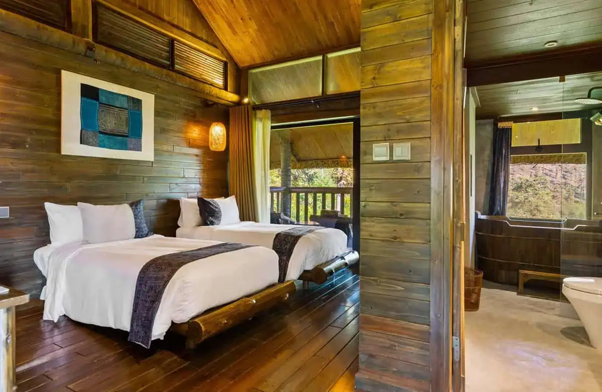 Khu nghỉ dưỡng có 36 căn bungalow hạng này. Phòng được làm từ 100% gỗ thông và cọ rất gần gũi với thiên nhiên. Nhờ cửa kính và ban công rộng, mọi người có thể bao quát toàn cảnh Thung Lũng Mường Hoa.