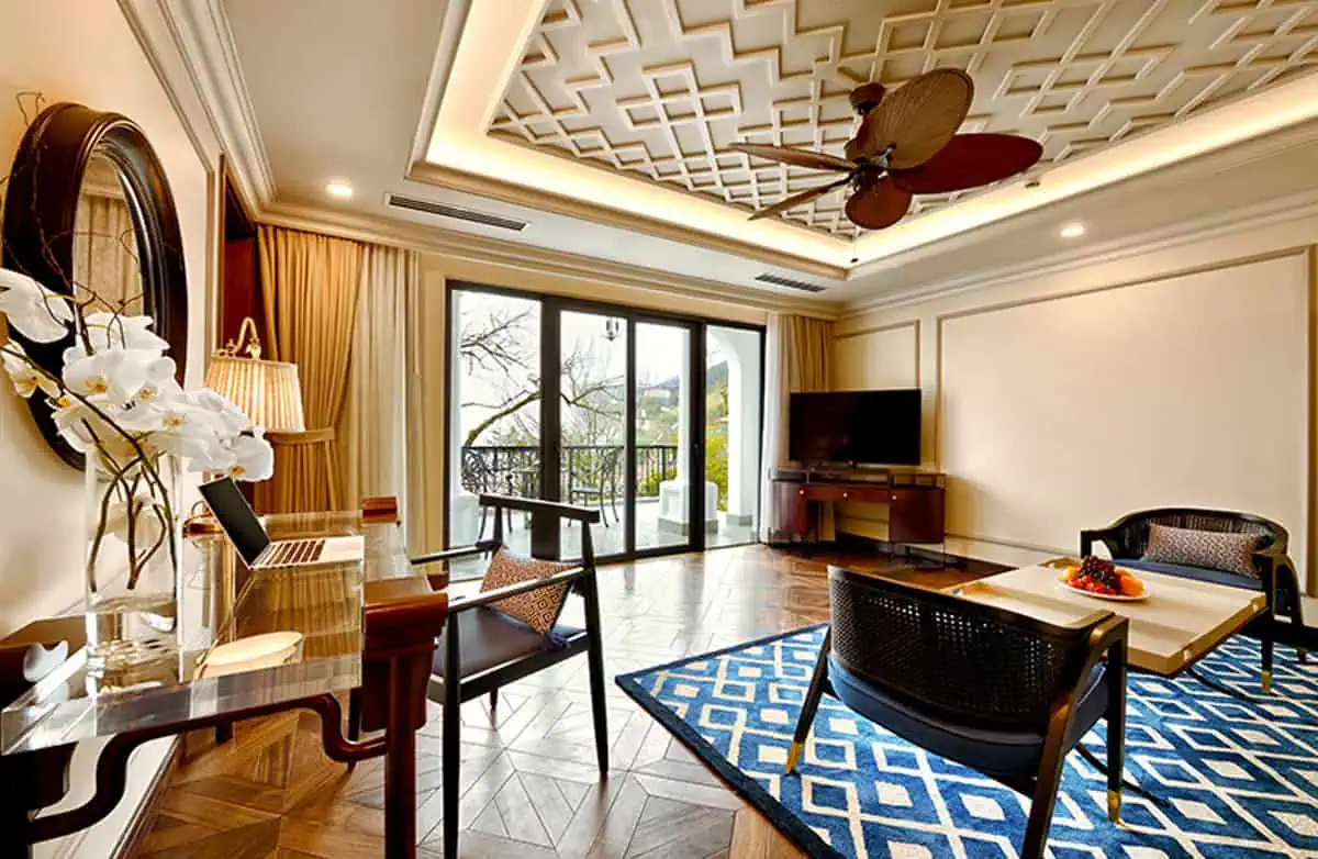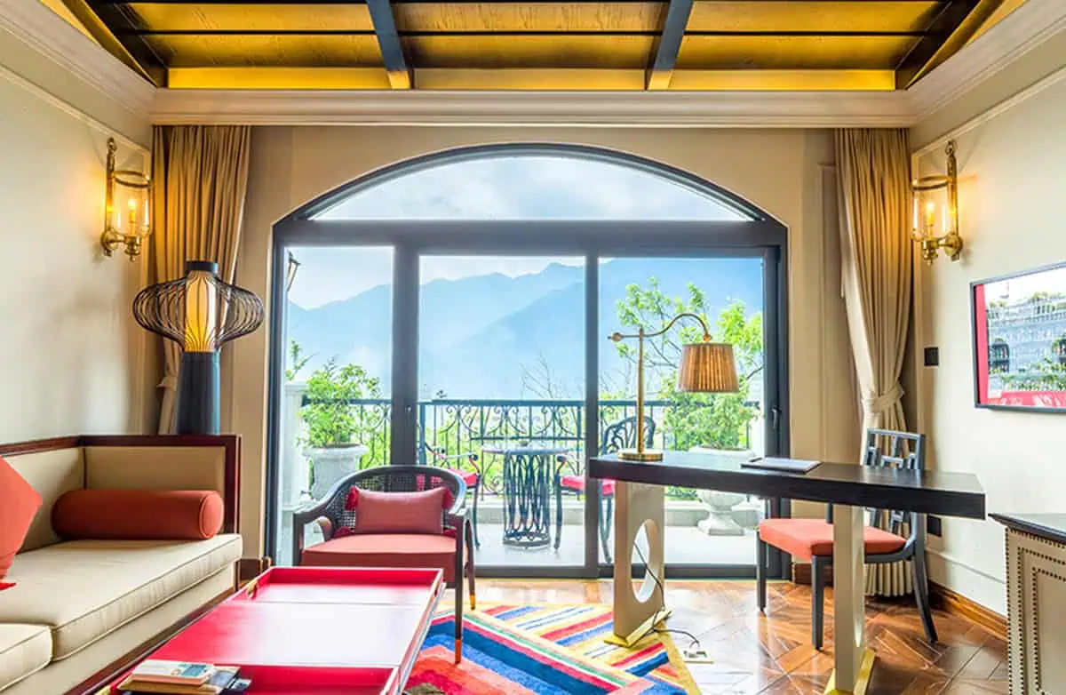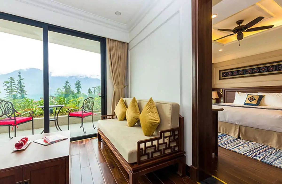Phòng nổi bật với tone vàng chủ đạo cùng điểm nhấn là các họa tiết trang trí đậm nét văn hóa bản địa. Hạng phòng này sở hữu phòng ngủ lớn và phòng khách riêng biệt cùng ban công riêng cho du khách ngắm nhìn khung cảnh ngoạn mục của thị trấn Sapa và Fansipan tráng lệ.