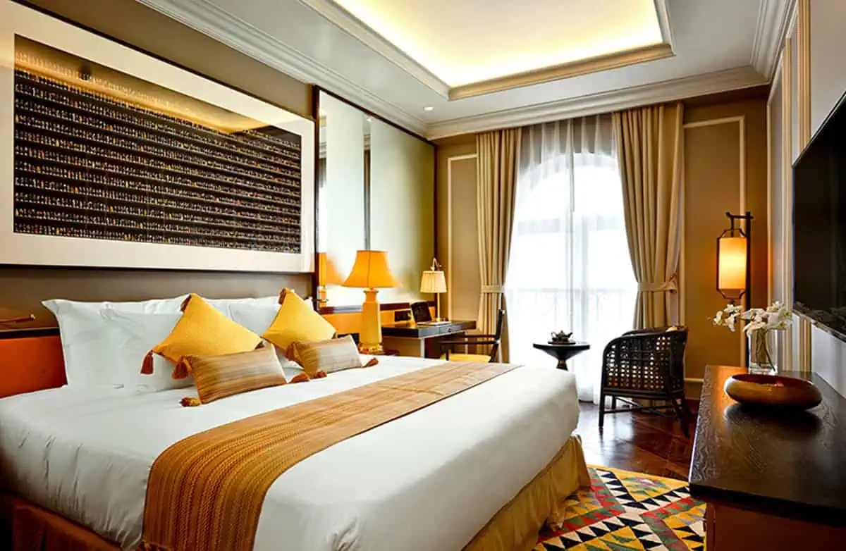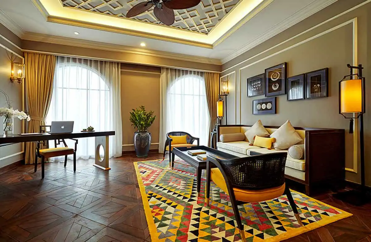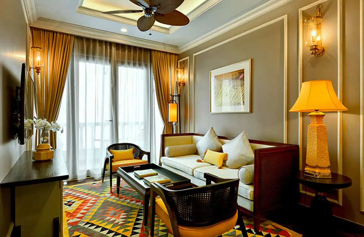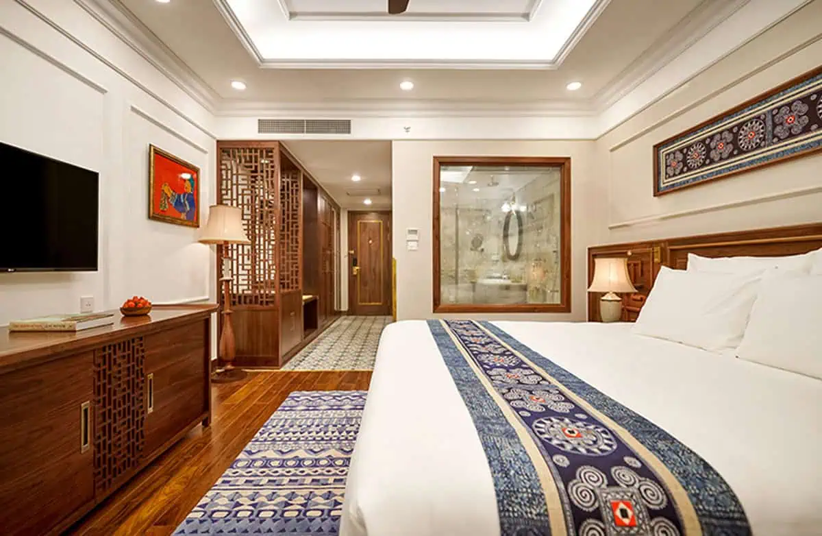 Phòng nổi bật với tone vàng chủ đạo cùng điểm nhấn là các họa tiết trang trí đậm nét văn hóa bản địa. Hạng phòng này sở hữu phòng ngủ lớn và phòng khách riêng biệt cùng ban công riêng cho du khách ngắm nhìn khung cảnh ngoạn mục của thị trấn Sapa và Fansipan tráng lệ.