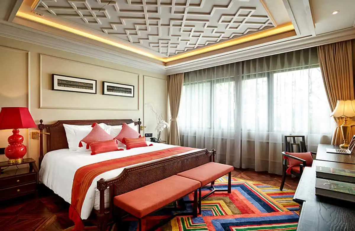 Phòng có thiết kế 2 tầng độc đáo: tầng trên là phòng khách sang trọng, tầng dưới là phòng ngủ tràn ngập ánh sáng cùng phòng tắm cao cấp. Căn phòng mang dáng vẻ tươi sáng nhờ những mảng màu đỏ rực rỡ cùng ban công thoáng mát hướng ra khu vườn hoa nở rộ và dãy Hoàng Liên Sơn.