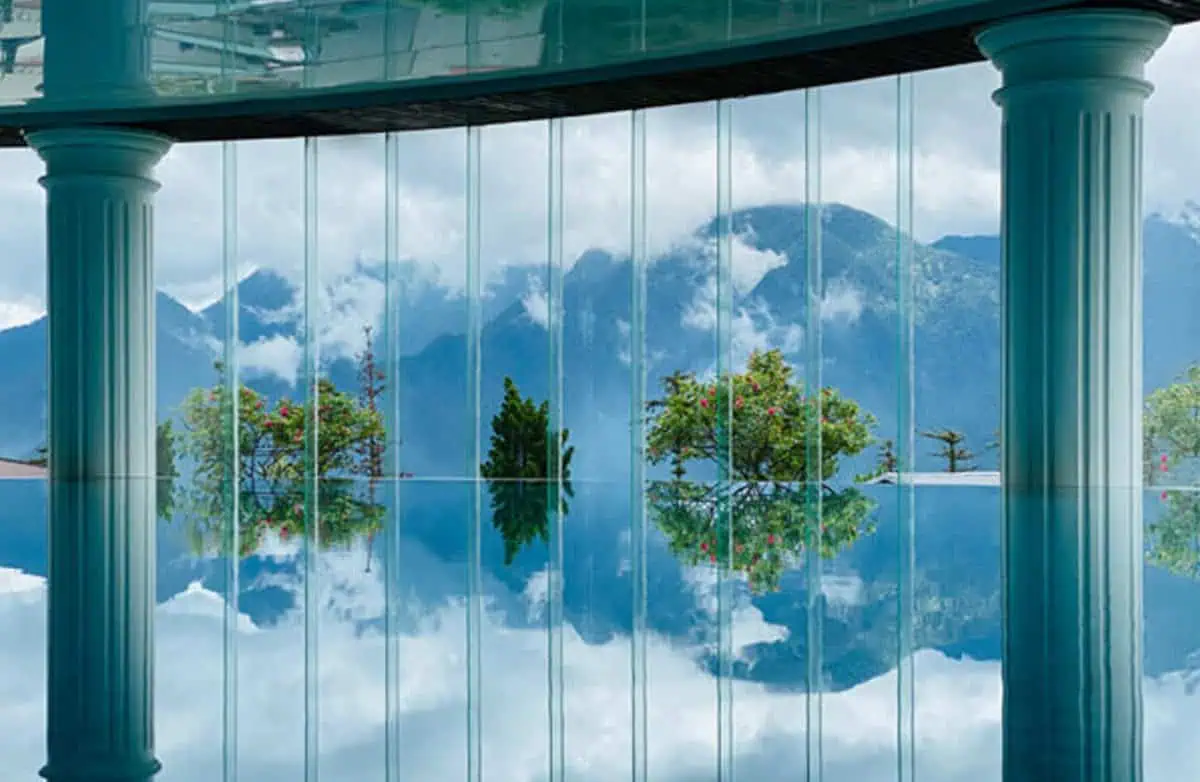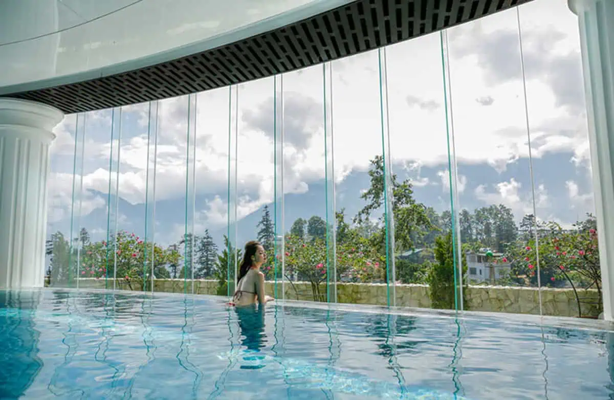 Với cánh cửa vòm rộng bằng kính, hồ bơi trong nhà cho du khách thỏa thích ngắm nhìn những dãy núi đồ sộ bên ngoài. Nước hồ trong veo phản chiếu bức tranh thiên nhiên xinh đẹp càng quyến rũ mọi người xuống ngâm mình, chụp ảnh.