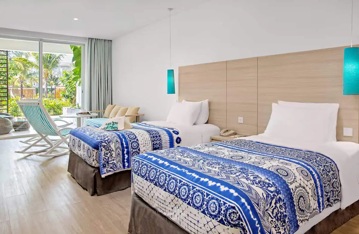 Căn phòng có sắc xanh được lấy cảm hứng từ biển cả và một lối đi thẳng tiện lợi ra hồ bơi hay khu vườn nhiệt đới từ ban công riêng.