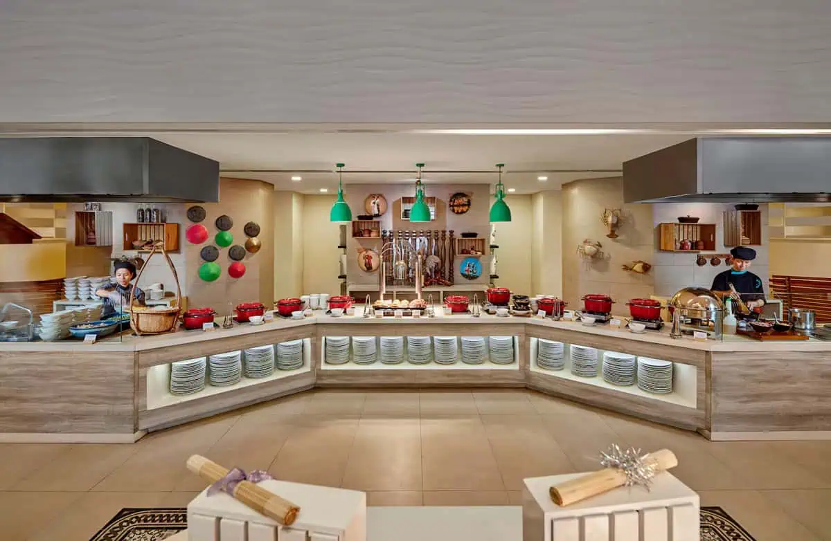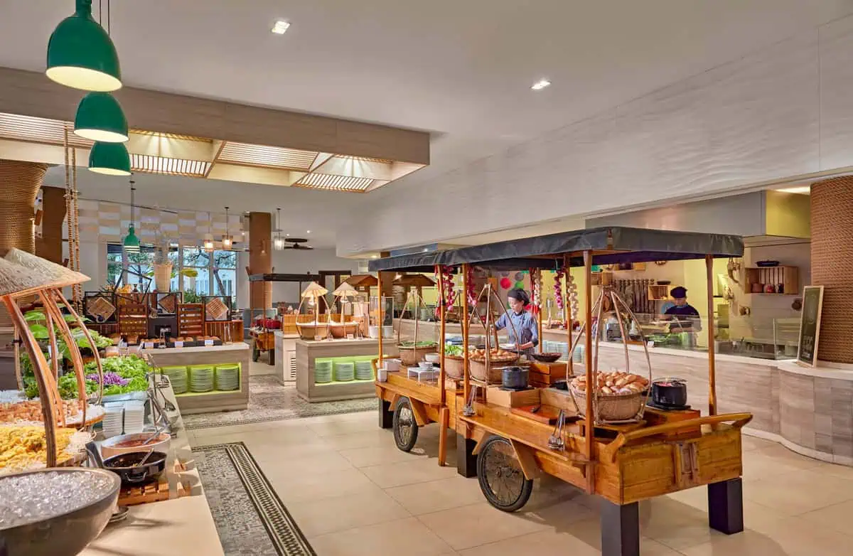 Nhà hàng The Kitchen có khung cảnh sôi động được thiên nhiên bao bọc sẽ gửi tặng du khách vô số món ăn đặc sản ngon khó cưỡng. ên trong nhà hàng được bày trí mô phỏng một khu chợ ở Châu Á, nhằm tạo nên trải nghiệm “ngon mắt, tròn vị” cho thực khách.