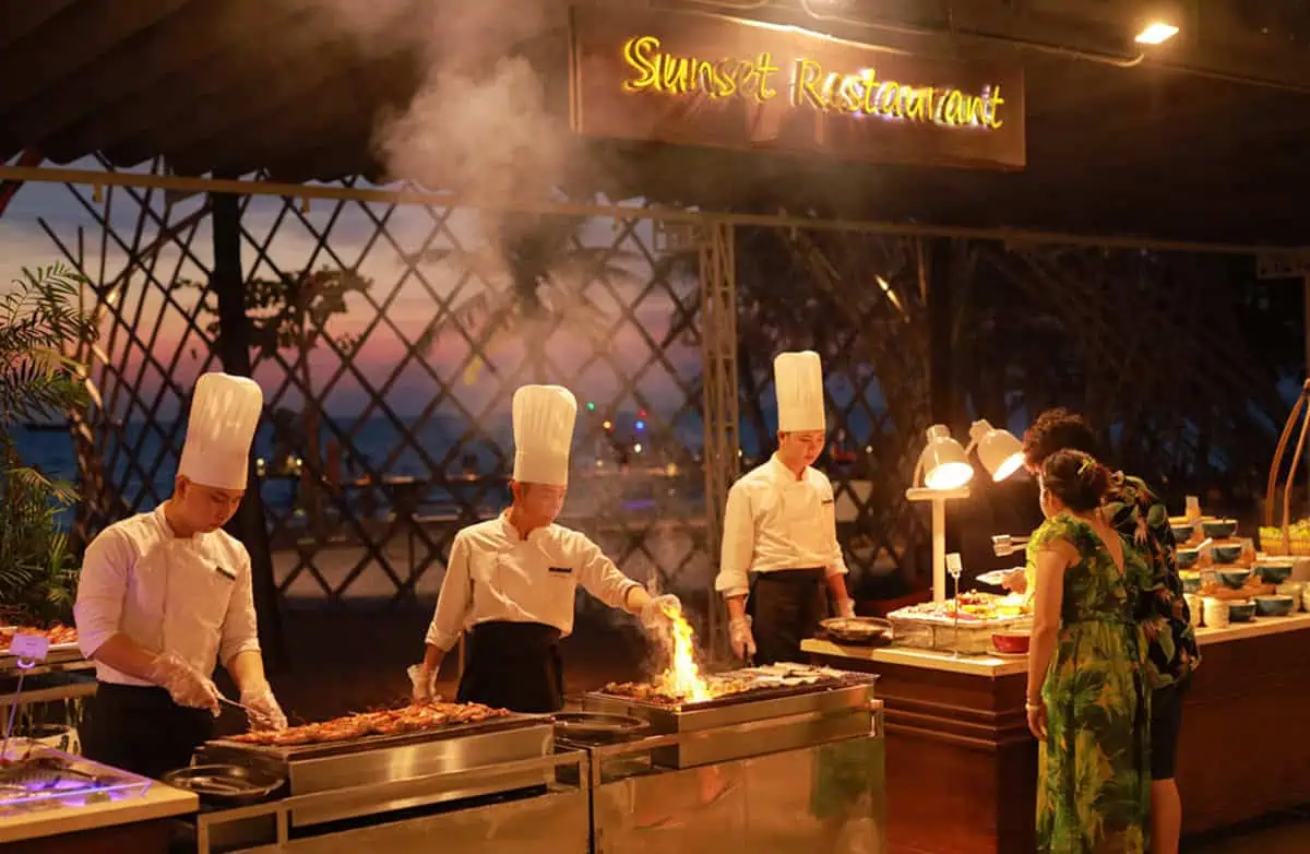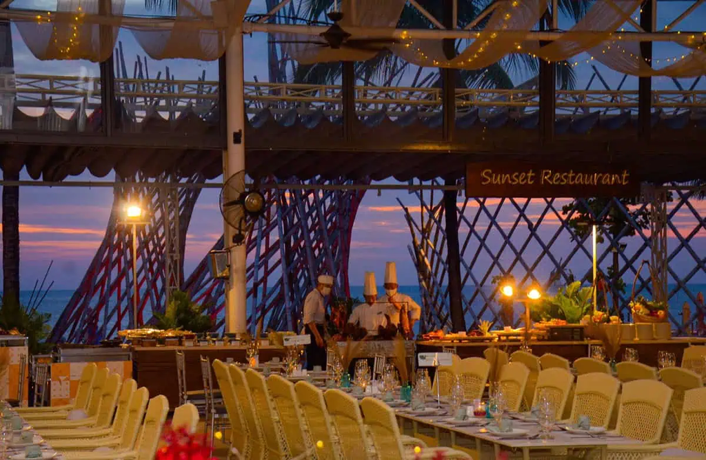 Nhà hàng Sunset: Nhà hàng mang đầy đủ những phong vị của nền ẩm thực Việt như hải sản và các món truyền thống, gồm không gian trong nhà và ngoài trời, gây ấn tượng với lối thiết kế mái uốn lượn như hình gợn sóng. Tại đây thực khách sẽ được phục vụ các phong cách tiệc đa dạng như Full moon party, Wine BBQ party, Seafood Market, International BBQ, Asia cuisine,…