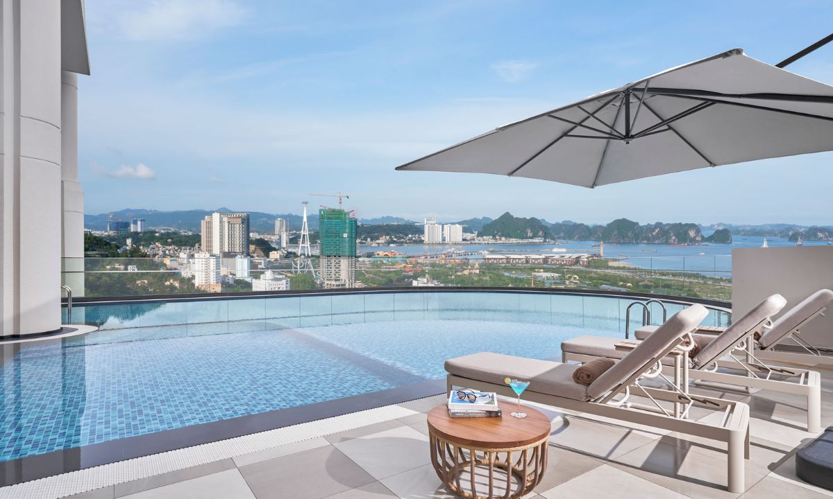 Hồ bơi ngoài trời của khách sạn được thiết kế có độ sâu linh hoạt từ 60-180cm, phù hợp cho cả gia đình. Bạn có thể đến đây để đọc sách, thưởng thức đồ ăn nhẹ, hay nhâm nhi những ly cocktail sáng tạo trong làn gió mát lành của vịnh Hạ Long.