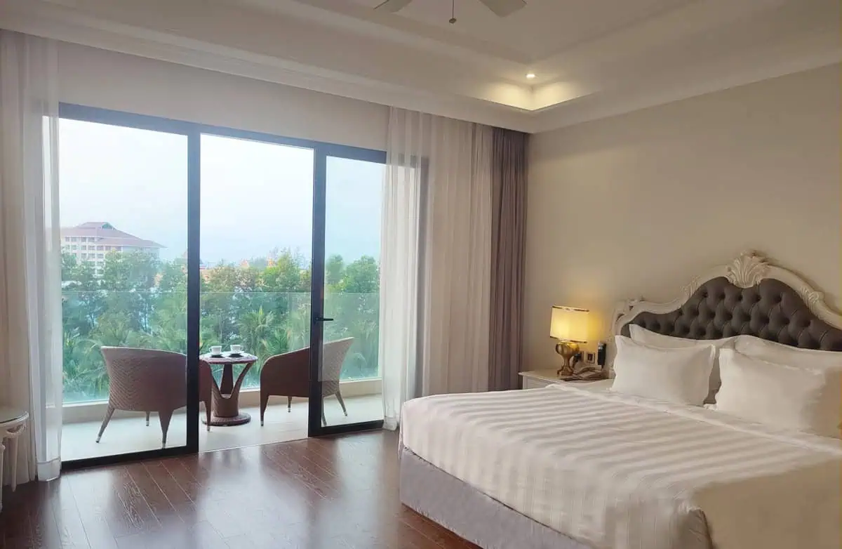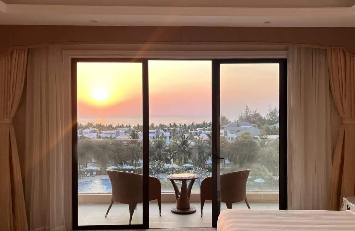 Phòng có ban công rộng rãi với bộ bàn ghế mây để du khách thưởng trà, đọc sách trong không khí trong lành. Buổi chiều, mọi người còn có thể ngắm ánh hoàng hôn đỏ rực từ từ buông xuống mặt biển với những căn view biển. Ngược lại, căn view vườn lại mở ra trước mắt du khách thảm thực vật xanh tươi tốt.