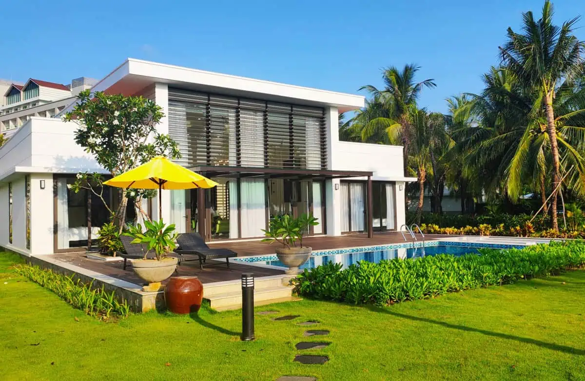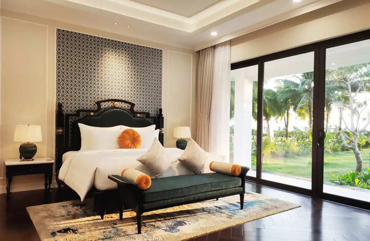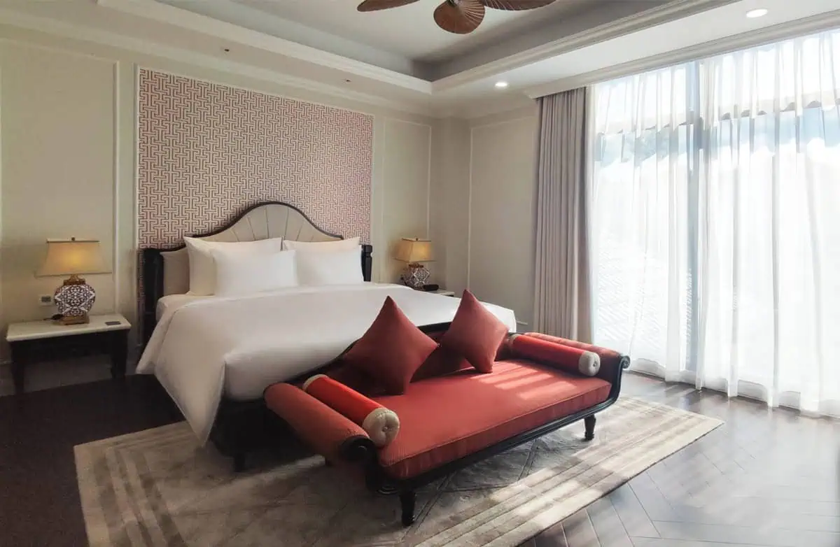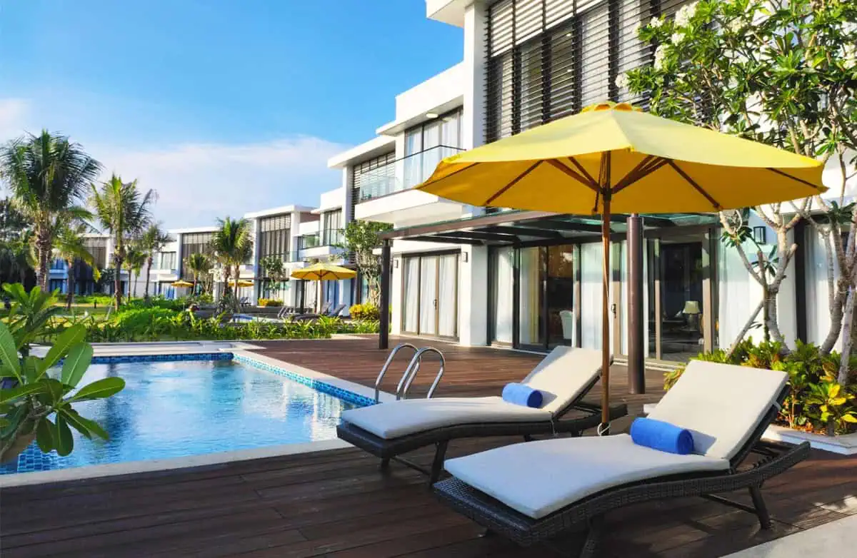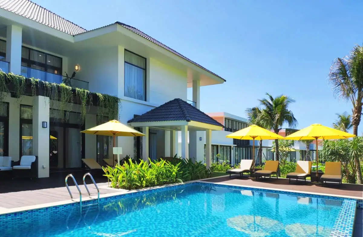 Biệt thự có hồ bơi riêng rộng rãi nằm dưới hàng dừa xanh cao, bên cạnh là những chiếc ghế dài tắm nắng. Phòng nổi bật với phong cách Indochine độc đáo, có những mảng màu đỏ tươi may mắn và rực rỡ.